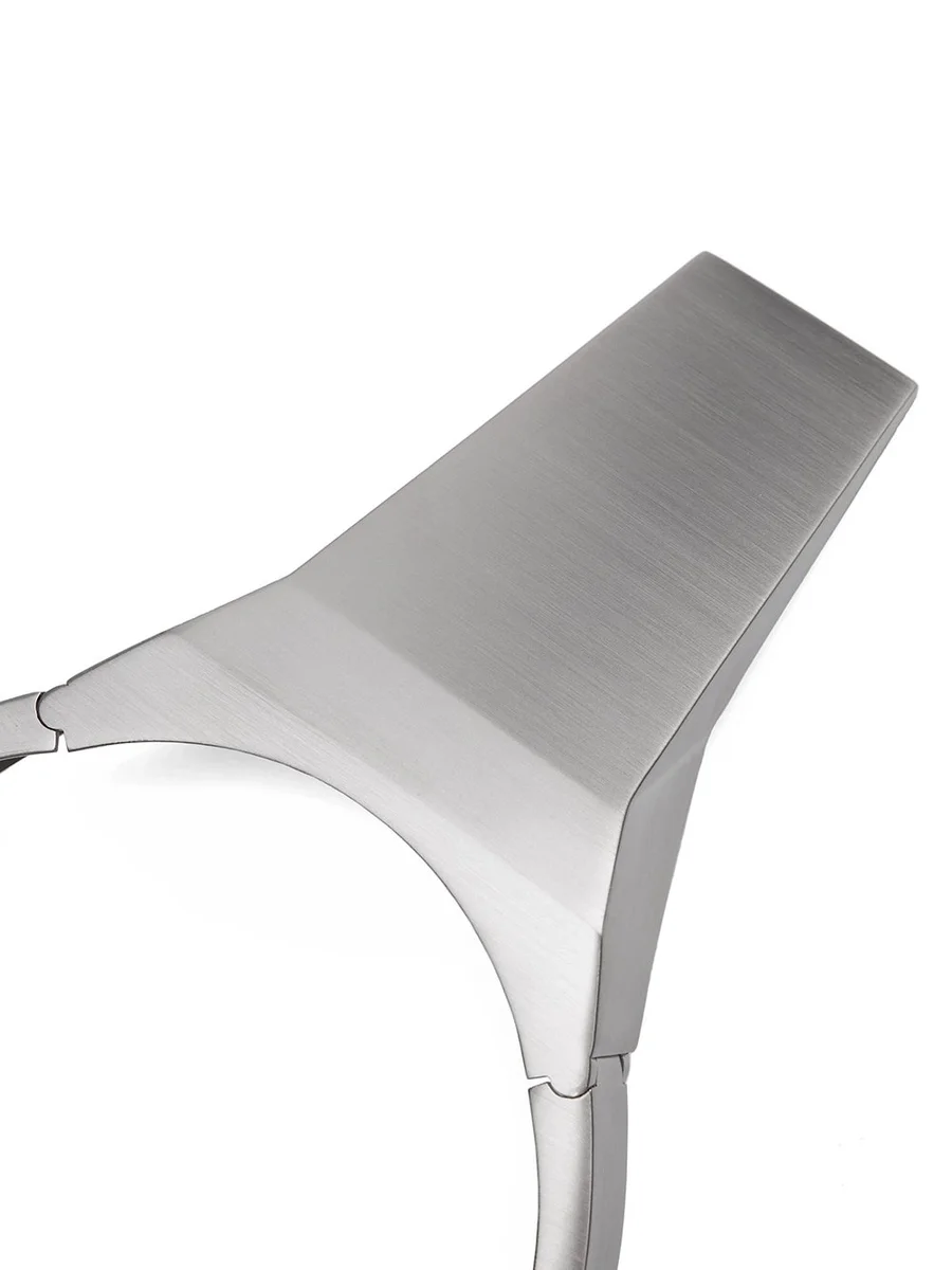 THISPLAIN TRUNK NECKLACEIS A RIGID METAL CUFF WITH ONE ENLONGATED BEVELED EDGES.IT HAS A HOLLOW INTERIOR, A MAGNETIC CLASP SIDE CLOSURE AND THE RICK OWENS LOGO ENGRAVED IN THE SIDE FACE.