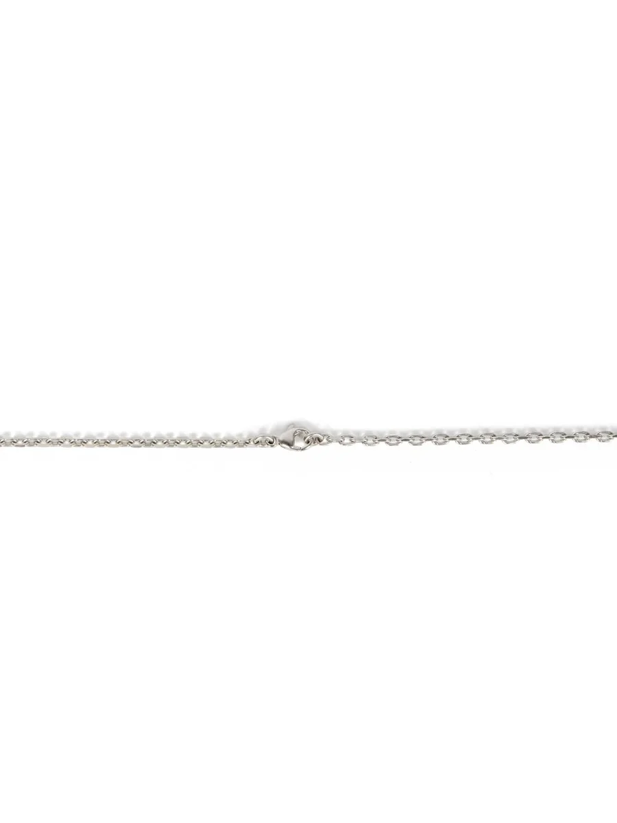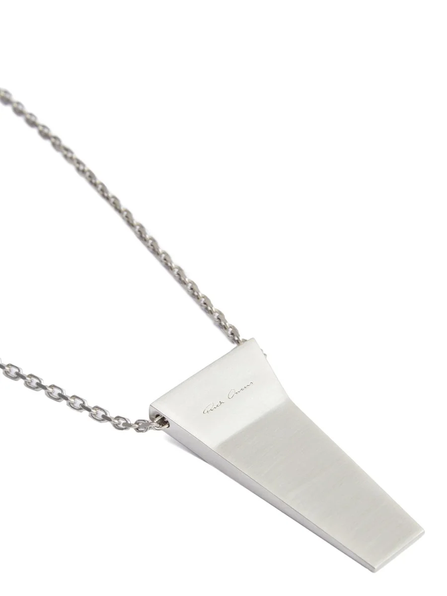THIS TRUNK CHARM NECKLACE HAS A SMALL GEOMETRIC TRUNK SHAPED CHARM WITH BEVELED EDGES HANGING FROM A CHAIN NECKLACE. IT HAS THE RICK OWENS LOGO ENGRAVED ON THE BACK.