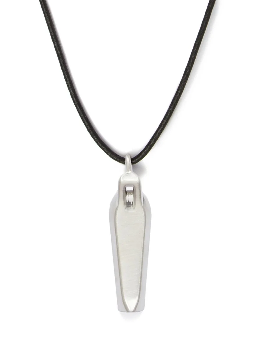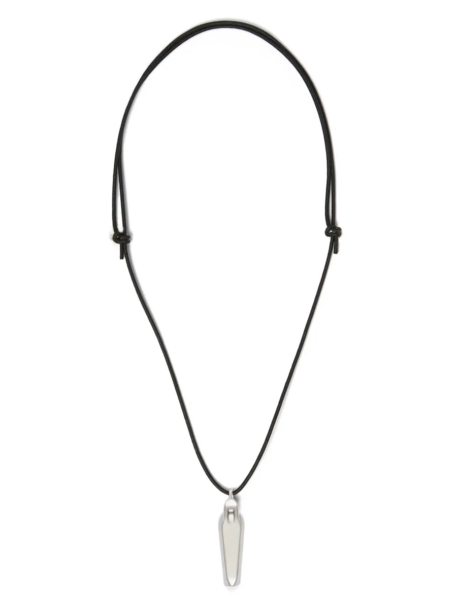THIS SARCOPHAGUS CHARM NECKLACE HAS A SMALL SARCOPHAGUS HANGING FROM AN ADJUSTABLE BLACK LEATHER THONG NECKLACE. IT HAS THE RICK OWENS LOGO ENGRAVED ON THE BACK.