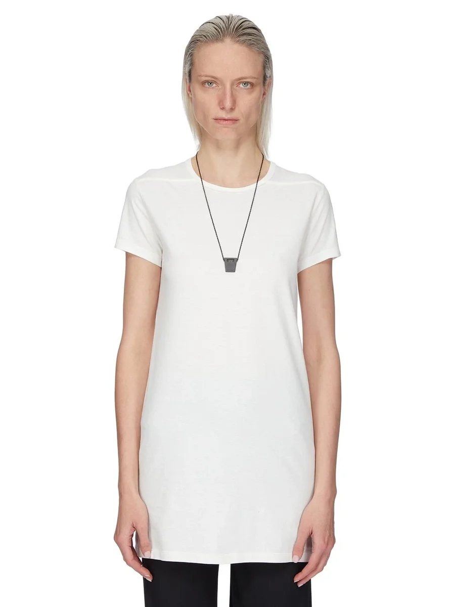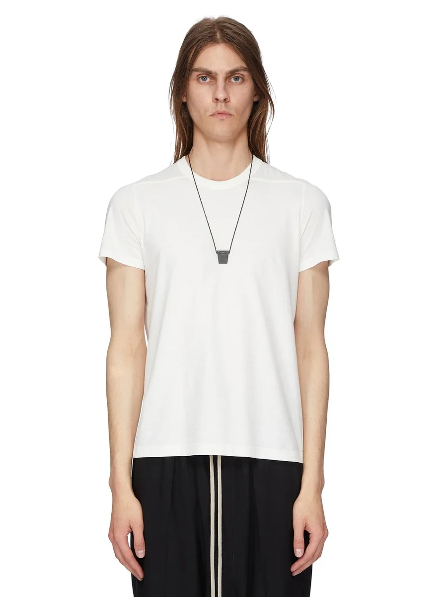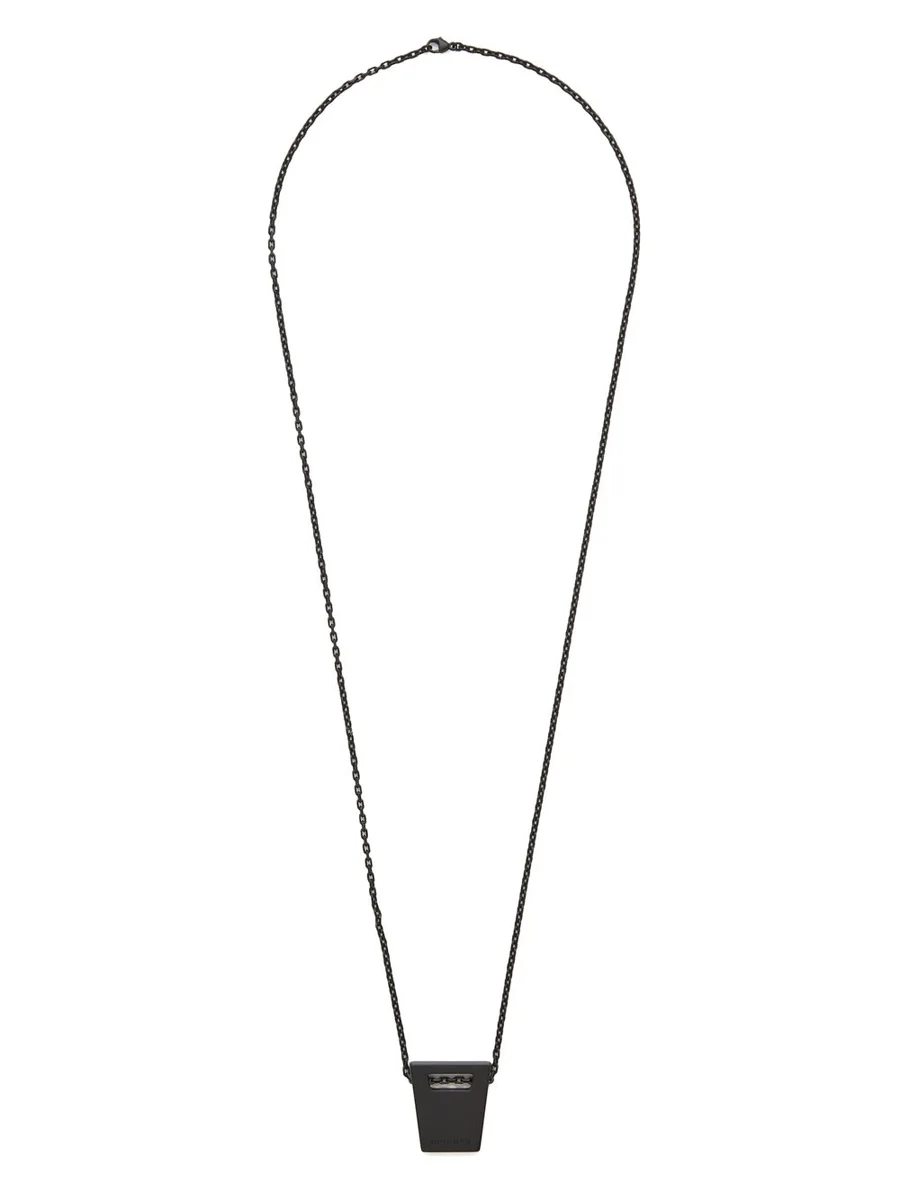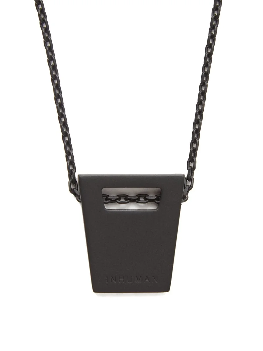 THIS DOGTAG CHARM NECKLACE HAS A SMALL GEOMETRIC TRUNK SHAPED CHARM ENGRAVED WITH SUPERHUMAN, HANGING FROM A CHAIN NECKLACE. IT HAS THE RICK OWENS LOGO ENGRAVED ON THE BACK.