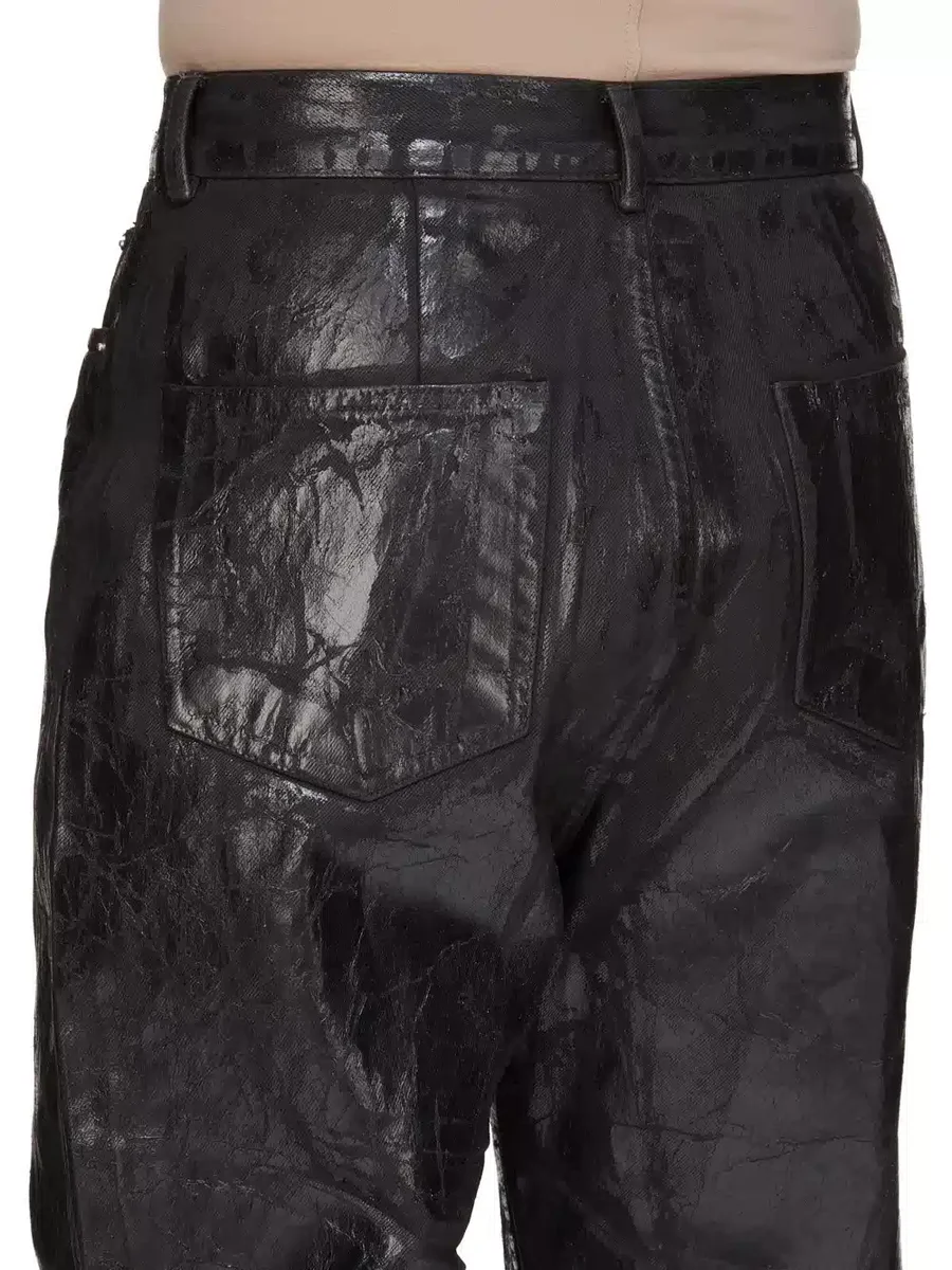 THIS MEDIUMWEIGHT MEGACRUST DENIM IS MADE ON A 13OZ BLACK AND NATURAL JPDENIM. THE READY GARMENT IS OVERDYED BLACK AND TREATED WITH A WAX FINISH, THEN SEVERAL LAYERS OF BLACK FOIL IS PRESSED ON TOP AND A FINAL WASH MAKES THE FOIL PEEL AND CRACK.