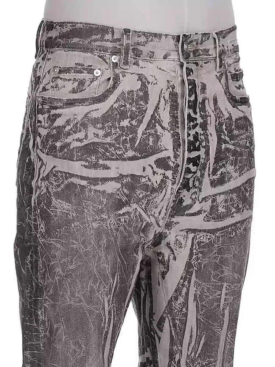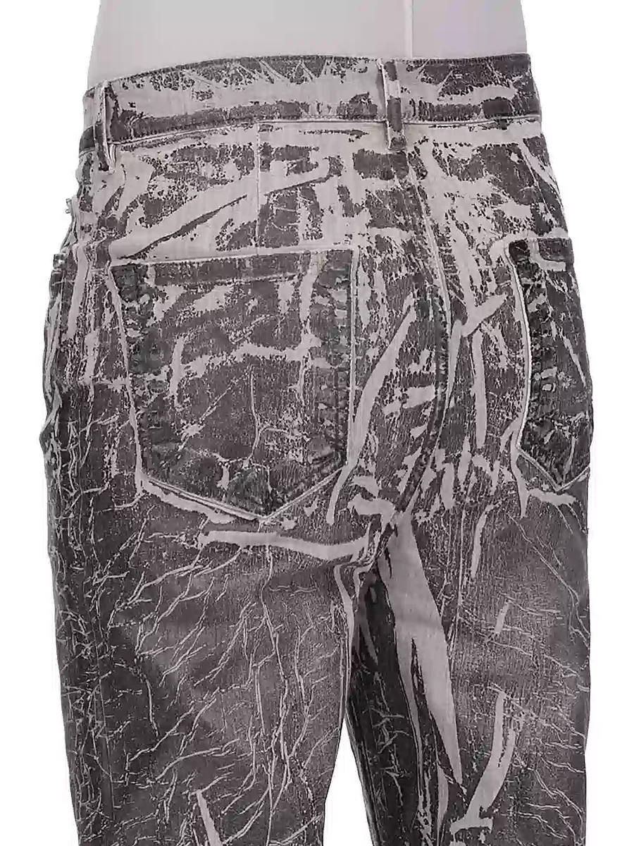 THIS LIGHTWEIGHT WASHED FOIL DENIM IS MADE ON A 10OZ BLACK AND NATURAL STRETCH DENIM. THE READY GARMENT IS BLEACHED INTO A DIRTY PEARL COLOR, A BLACK FOIL OVERLAY IS THEN APPLIED AND FINALLY THE GARMENT IS WASHED TO ACHIEVE THE IRREGULAR LOOK.