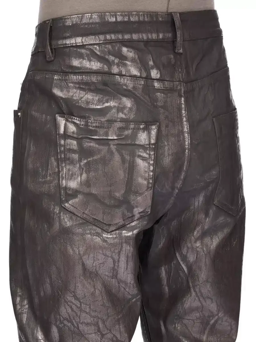THIS LIGHTWEIGHT BRONZE MEGACRUST DENIM IS MADE ON A 10OZ BLACK AND NATURAL STRETCH DENIM. THE READY GARMENT IS OVERDYED DRKDUST AND THEN TREATED WITH LAYERS OF BRONZE COLORED FOIL THAT IS PRESSED ON BY HAND.