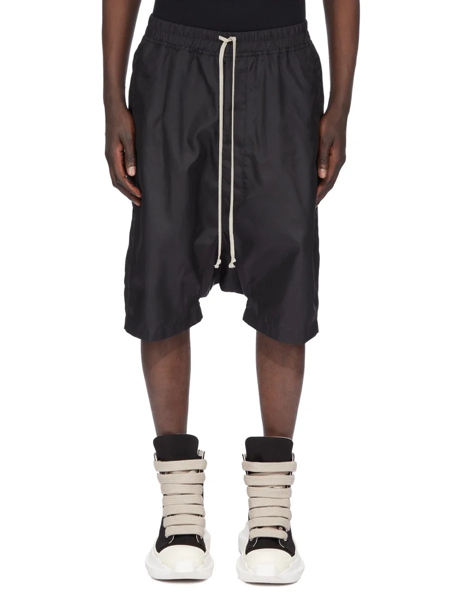 THESE DRAWSTRING PODS ARE BELOW KNEE LENGTH WITH A DROPPED CROTCH. THEY HAVE AN ELASTICIZED WAISTBAND WITH DRAWSTRING AND STITCHED FLY AND SIDE POCKETS. THEY HAVE A SEAMED CENTRE BACK PANEL AND BACK POCKETS WITH FLAPS AND TOPSTITCHING.