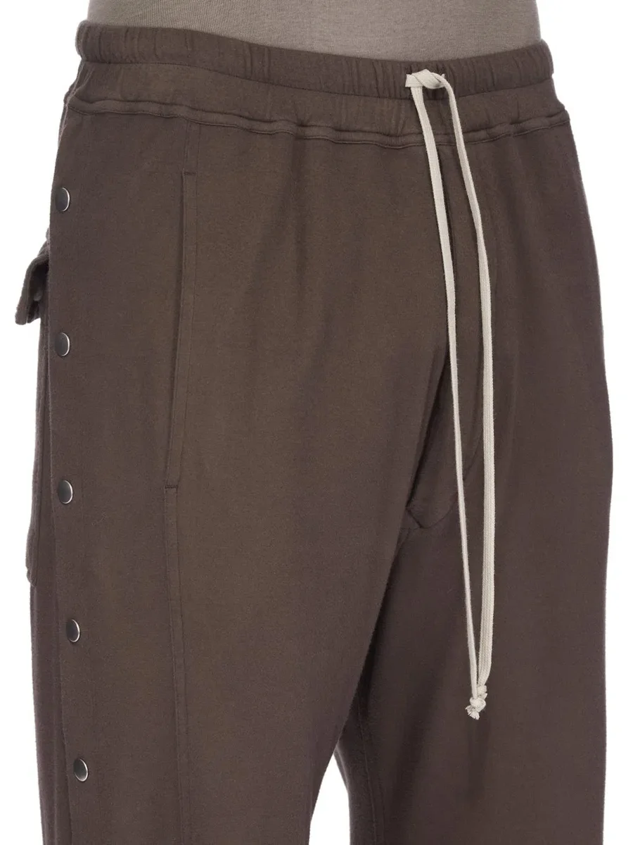 THESE PUSHER PANTS ARE FLOOR LENGTH WITH A WIDE LEG AND A SLIGHTLY DROPPED CROTCH. THEY HAVE AN ELASTICIZED WAISTBAND WITH DRAWSTRING, SIDE FRONT JET POCKETS AND SQUARE BACK POCKETS WITH TOPSTITCHING. THEY FEATURE VISIBLE SNAP CLOSURES RUNNING DOWN THE OUTER LEG, ALLOWING THEM TO BE UNSNAPPED AND WORN OPEN.
