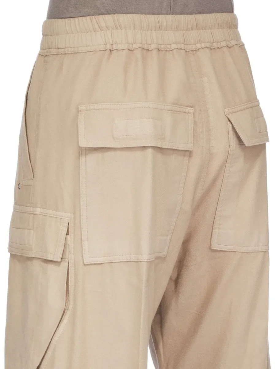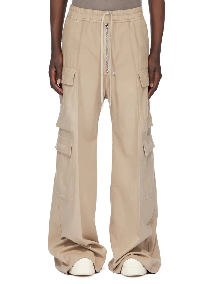 THESE DOUBLE CARGO JUMBO BELA PANTS ARE FULL-LENGTH WITH A LOW CROTCH AND WIDE LEG. THEY FEATURE AN ELASTICIZED WAISTBAND WITH DRAWSTRING AND A BELA EXPOSED CENTER ZIPPER WITH TWO SNAP DETAIL, AND SIDE WELT POCKETS WITH RIVETS. THEY FEATURE TWO BEVELED CARGO POCKETS ON THE THIGH, WITH TWO SQUARE CARGO POCKETS BELOW AND TWO SQUARE BACK POCKETS. THEY ALL HAVE FLAPS AND TOPSTITCHING.