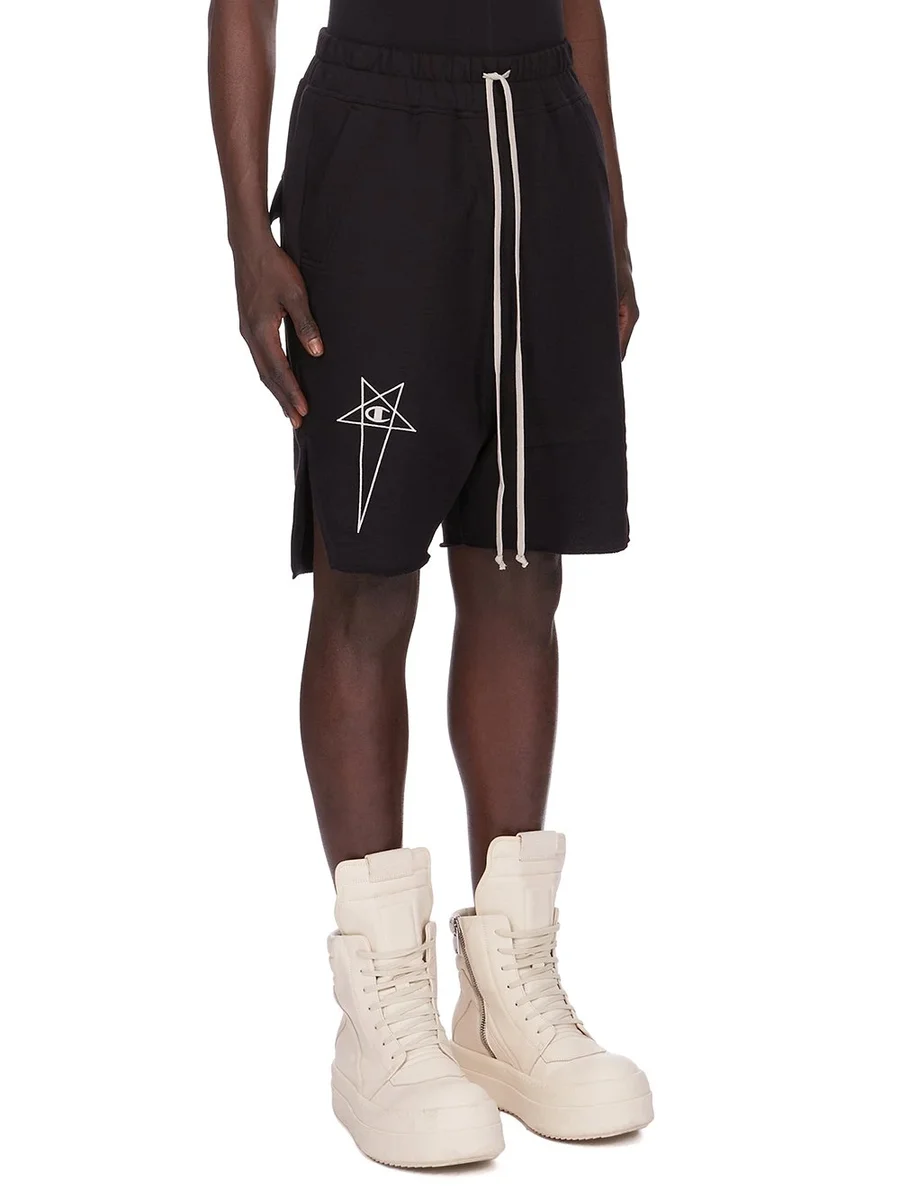 THEY HAVE A 3D EMBROIDERED SIGNATURE CHAMPION X RICK OWENS PENTAGRAM LOGO ACROSS FRONT AND A CHAMPION LOGO ON THE BACK HIP.