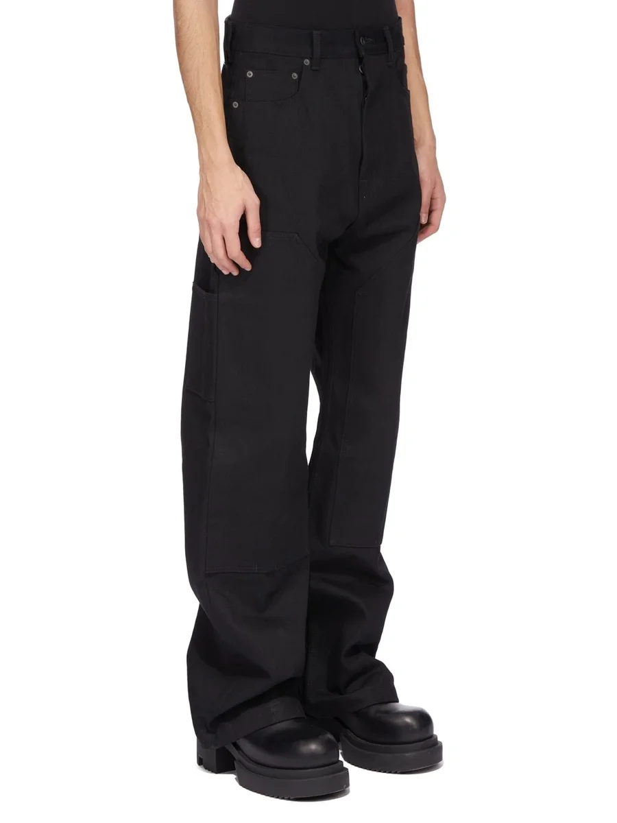 THE STROBE DOUBLE KNEE IS A LOW-RISE, WIDE FIT JEAN WITH GEOMETRIC LAYERED KNEE PATCHES, 6 POCKETS AND A BUTTON FLY. THIS VERSION HAS ADDED REAR ‘TOOL POCKETS’ AND ‘HAMMER LOOP’. THEY FEATURE A BLACK LEATHER DRKSHDW DEBOSSED PATCH ON THE REAR OF THE WAISTBAND BELT LOOPS THAT ARE SEWN INTO THE WAISTBAND, FOR ADDED STRENGTH. THERE IS A SELVEDGE DETAIL ON THE ‘COIN POCKET’, AND THE OUTSEAM (34″ INSEAM), AND HIDDEN RIVETS IN THE REAR POCKETS. THEY HAVE A CHINO STYLE STRAIGHT STITCH HEM. ALL HARDWARE IS YKK (MADE IN JAPAN).