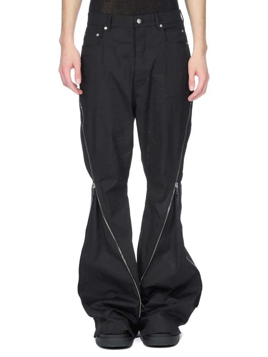 THIS BOLAN BANANA IS A HIGH WAISTED, SLIM FIT 5 POCKET JEAN WITH A FLOOR-LENGTH BOOT CUT. THEY HAVE A CONCEALED BUTTON FLY AND A WAISTBAND WITH CENTRE BUTTON, BELT LOOPS AND POCKET RIVETS AND BACK PATCH POCKETS WITH TOPSTITCHING. THEY FEATURE A LONG ZIPPER RUNNING FROM CENTRE BUTT, CURVING AROUND THE HIP TO THE HEM. IT CAN UNZIP AT BACK TO EXPOSE THE BUTT, AND ALSO ZIP UP FROM THE HEM TO EXPOSE AN INNER FLARED PANEL IN THE LEG.