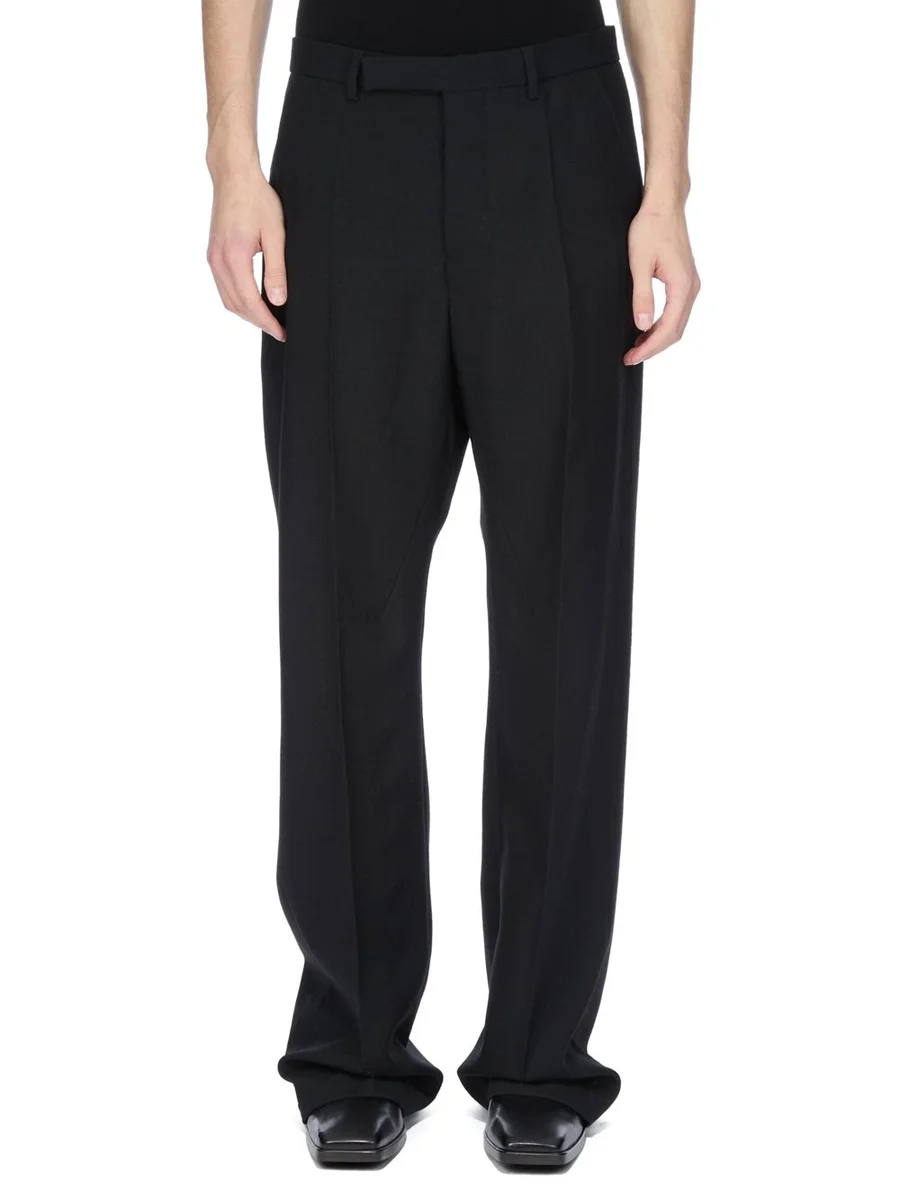 THESE TAILORED GETH ARE FULL LENGTH WITH A MID-RISE AND WIDE FIT. THEY HAVE A CLASSIC TAILORED WAISTBAND WITH A CONCEALED ZIPPER AND WRAP BUTTON CLOSURE, BACK WELT POCKETS WITH BUTTONS, AND PRESSED CREASES ON THE FRONT AND BACK LEG.