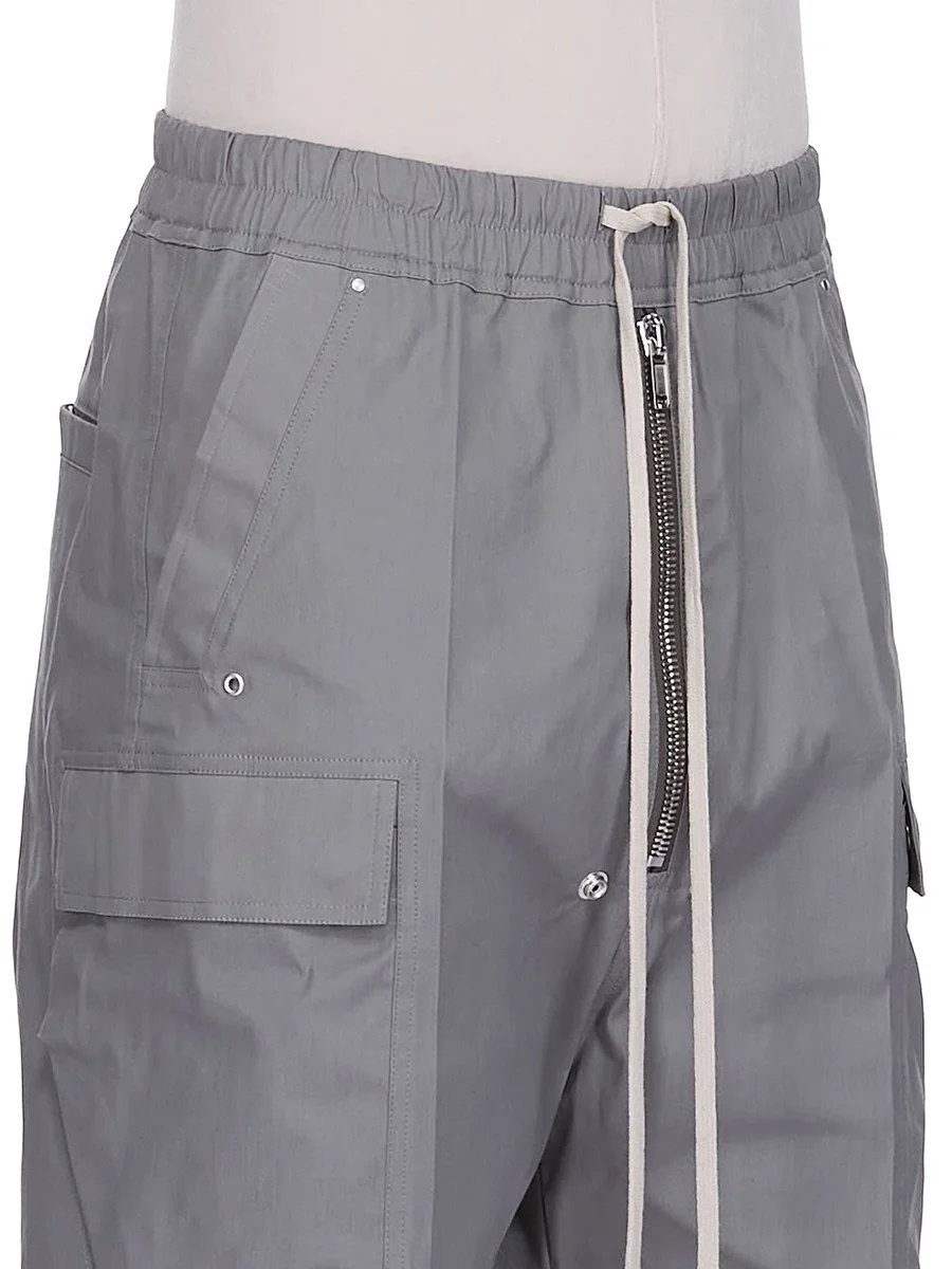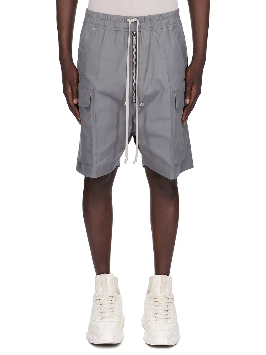 THESE CARGOBELA SHORTS ARE KNEE-LENGTH WITH A LOW CROTCH AND WIDE LEG. THEY FEATURE AN ELASTICIZED WAISTBAND WITH DRAWSTRING AND A BELA EXPOSED CENTER ZIPPER WITH TWO SNAP DETAIL AT BOTTOM. THEY FEATURE TWO BEVELED CARGO POCKETS ON THE SIDE LEG WITH TWO REAR WELT POCKETS, ALL WITH CONCEALED SNAPS AND TOPSTITCHING.