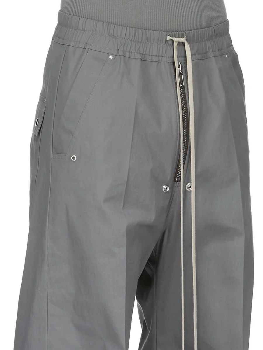 THESE WIDE BELA PANTS ARE FULL-LENGTH WITH A LOW CROTCH AND WIDE LEG. THEY FEATURE AN ELASTICIZED WAISTBAND WITH DRAWSTRING AND A BELA EXPOSED CENTER ZIPPER WITH TWO SNAP DETAIL AT BOTTOM. THEY HAVE SIDE WELT POCKETS WITH RIVET AND EYELET DETAIL AND BACK POCKETS WITH FLAPS AND SNAP CLOSURES.