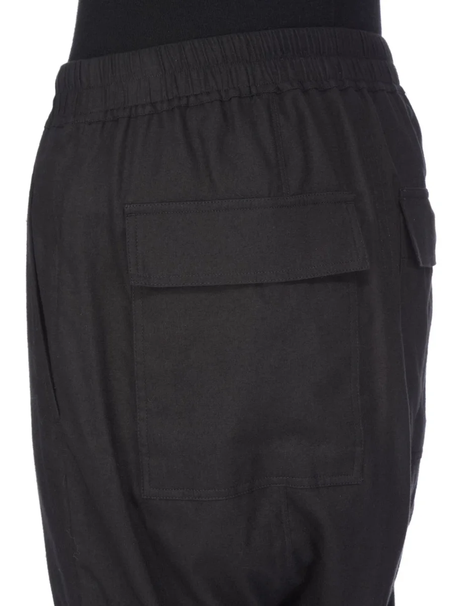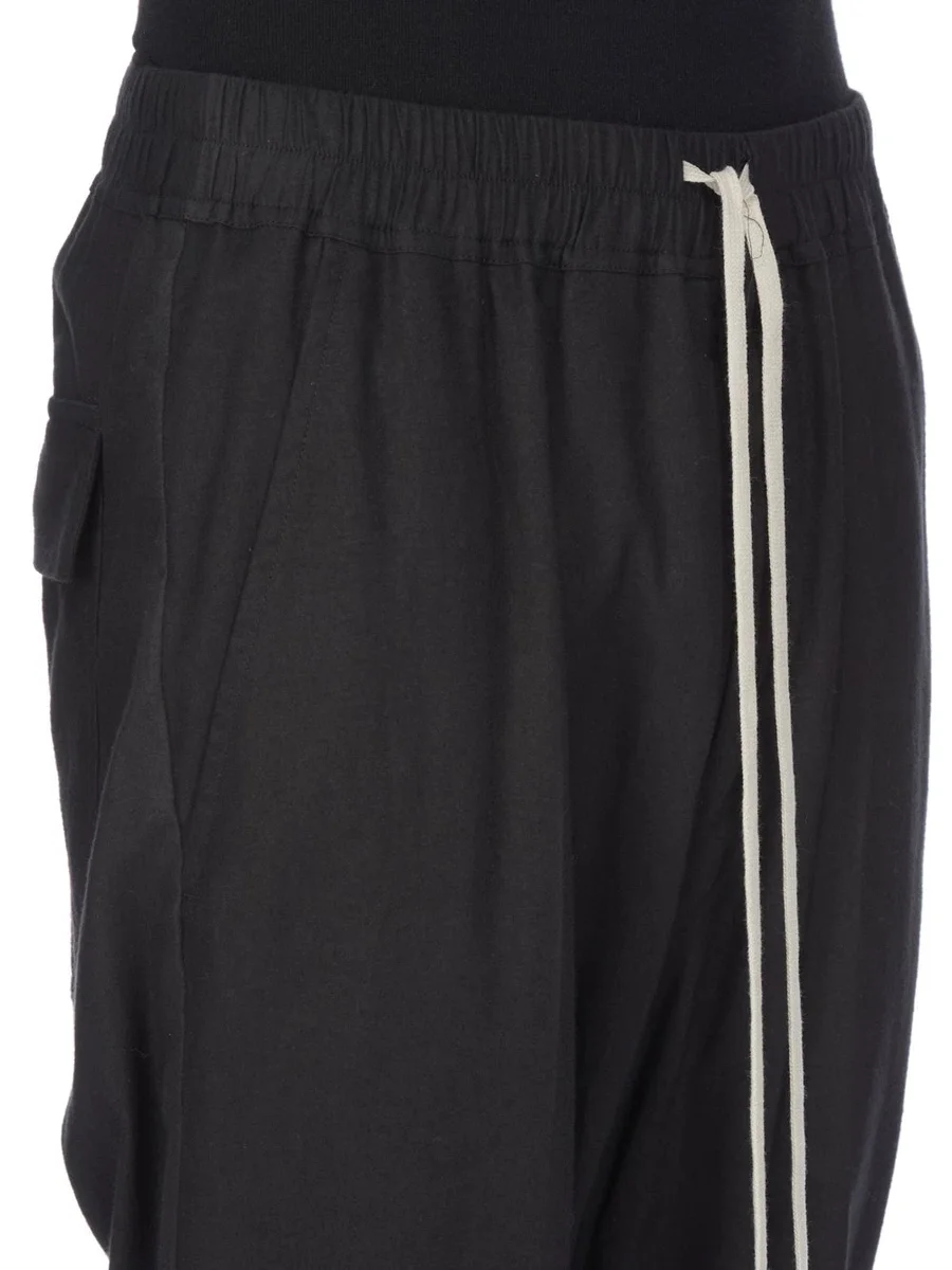 THESE DRAWSTRING LONG PANTS ARE FULL LENGTH WITH A DROPPED CROTCH. THEY HAVE AN ELASTICIZED WAISTBAND WITH DRAWSTRING, A CONCEALED FLY, AND CREASES IN THE FRONT AND BACK LEG. THEY FEATURE TWO SIDE FRONT POCKETS AND TWO SQUARE BACK POCKETS WITH FLAPS AND TOPSTITCHING.