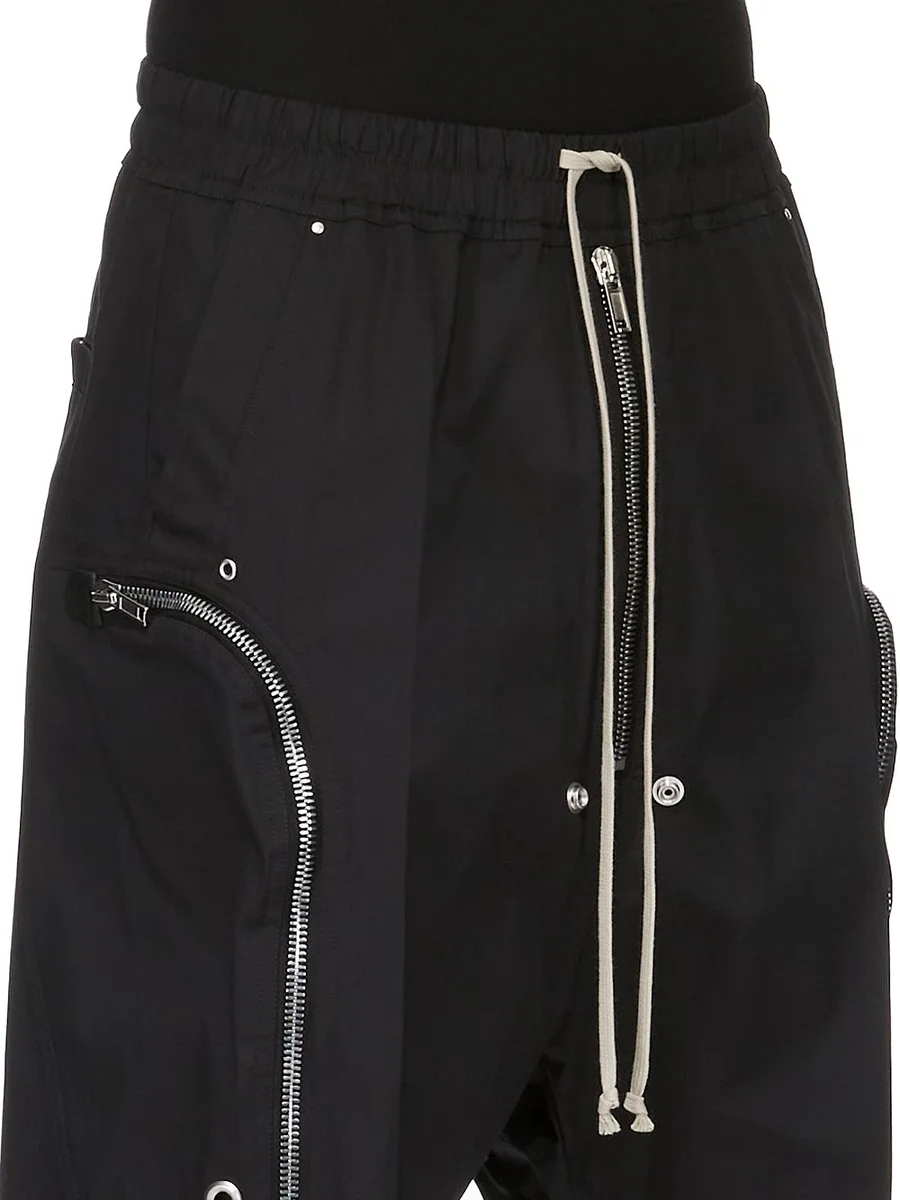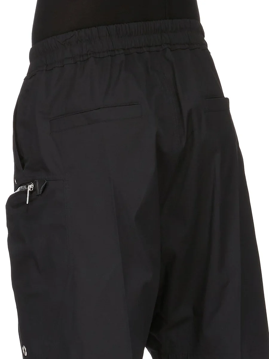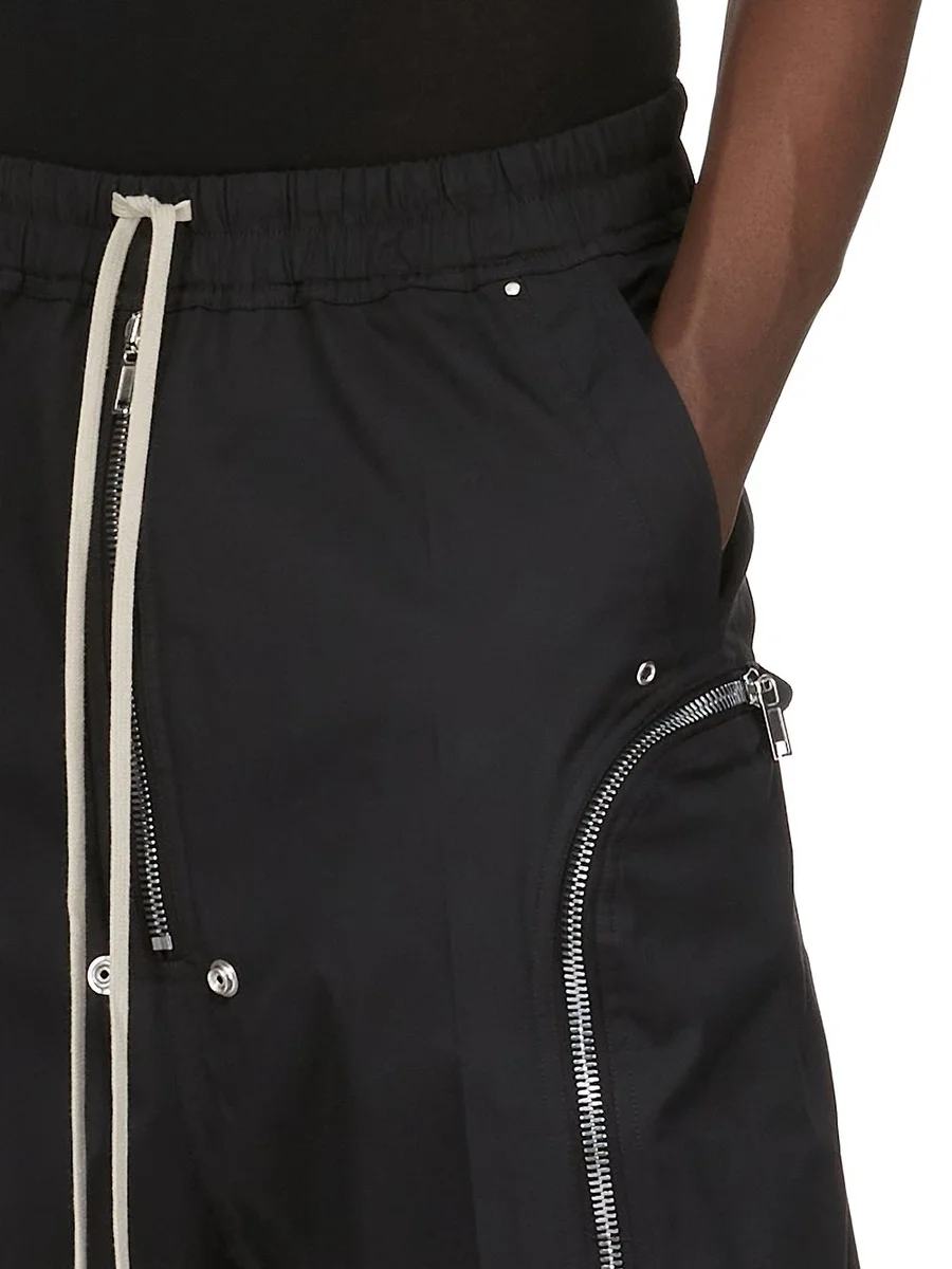 THESE BAUHAUS BELAS ARE KNEE LENGTH AND FEATURE AN ELASTICIZED WAISTBAND WITH DRAWSTRING. THEY HAVE A BELA EXPOSED CENTRE ZIPPER WITH TWO SNAP DETAIL AT BOTTOM, AND A LOW CROTCH. THEY FEATURE SIDE WELT POCKETS WITH EYELET AND RIVET DETAIL, BAUHAUS ZIPPERED POCKETS WITH LARGE EYELETS, AND BACK POCKETS WITH FLAP AND SNAP CLOSURES.