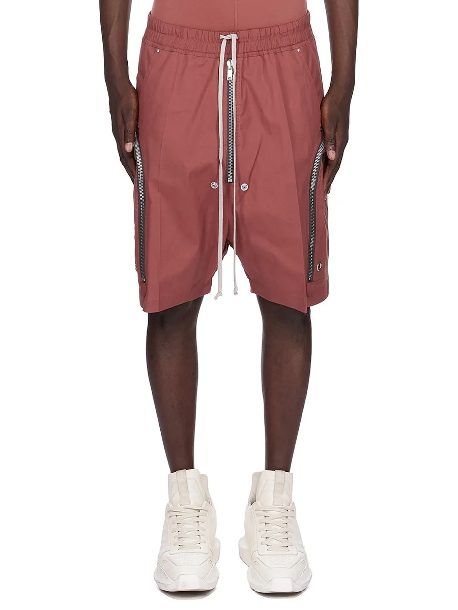 THESE BAUHAUS BELAS ARE KNEE LENGTH AND FEATURE AN ELASTICIZED WAISTBAND WITH DRAWSTRING. THEY HAVE A BELA EXPOSED CENTRE ZIPPER WITH TWO SNAP DETAIL AT BOTTOM, AND A LOW CROTCH. THEY FEATURE SIDE WELT POCKETS WITH EYELET AND RIVET DETAIL, BAUHAUS ZIPPERED POCKETS WITH LARGE EYELETS, AND BACK POCKETS WITH FLAP AND SNAP CLOSURES.