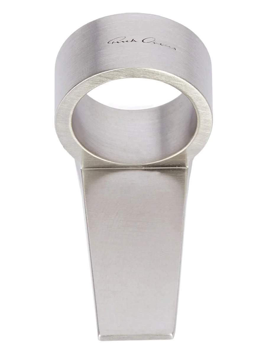THIS TRUNK RING IS A THICK BAND WHICH EXTENDS INTO A GEOMETRIC TRUNK SHAPE WITH BEVELED EDGES AND THE RICK OWENS LOGO ENGRAVED ON THE BACK. THESE JEWELLERY PIECES ARE CRAFTED WITH THE INDIVIDUAL HANDWORK OF THE ARTISAN, MAKING EACH PIECE UNIQUE.