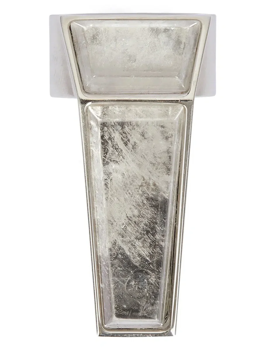 THIS CRYSTAL TRUNK RING IS A THICK BAND WHICH EXTENDS INTO A GEOMETRIC TRUNK SHAPE WITH BEVELED EDGES, ORNAMENTED WITH TWO RECTANGULAR ROCK CRYSTALS AND THE RICK OWENS LOGO ENGRAVED ON THE BACK.