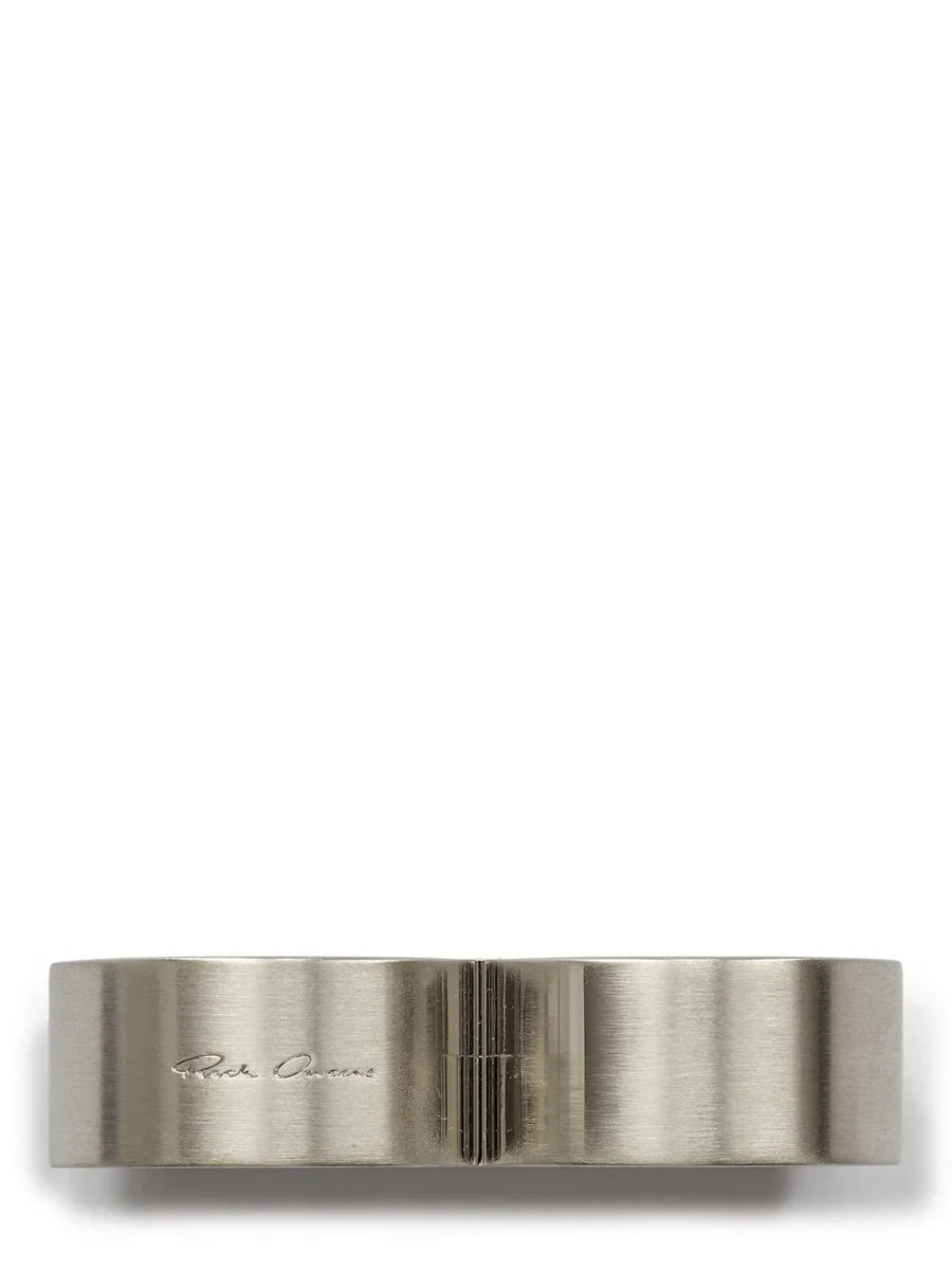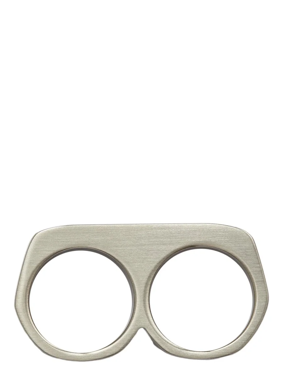 THIS DOUBLE GRILL RING IS A DOUBLE FINGER THICK BAND WITH TWO GRILL OPENINGS. IT HAS THE RICK OWENS LOGO ENGRAVED ON THE BACK.