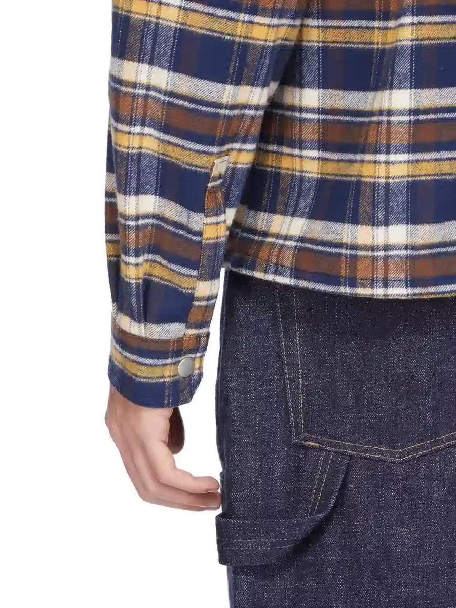 THIS CROPPED OUTERSHIRT IS ABOVE HIP LENGTH WITH A STRAIGHT, BOXY FIT AND LONG SLEEVES. IT HAS A CENTRE FRONT OPENING WITH VISIBLE YKK SNAPS (MADE IN JAPAN), A COLLAR, A HEM WITH BEVELED SIDE SEAMS AND CHAINSTITCH THREAD RUN-OFF, AND SNAP CUFFS. IT FEATURES TWO SQUARE POCKETS ON THE CHEST WITH FLAPS AND BEVELED CORNERS, SIGNATURE LEVEL SHOULDER SEAMS AND DOUBLE STITCHED SEAMS.