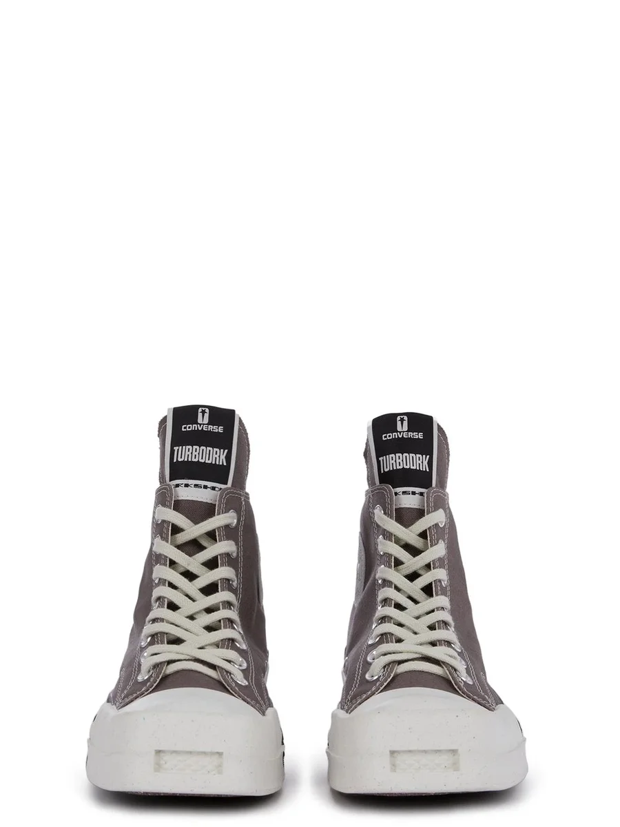 THESE CONVERSE X DRKSHDW TURBODRK LACELESS HI TOPS ARE BASED ON THE CLASSIC CONVERSE 70’S CHUCKS. THEY FEATURE A SIGNATURE DRKSHDW ELONGATED TONGUE WITH A CUSTOM BRANDED WRAP AROUND WOVEN LABEL BEARING THE MODEL NAME. THEY HAVE A CLASSIC 70’S CHUCKS CONVERSE SOLE, BOLSTERED BY A SIGNATURE RICK OWENS SOLE, MOLDED RUBBER HEEL AND TOE CAP WITH A DISTINCTIVE SPECKLED AESTHETIC. THIS IS SUPERIMPOSED WITH A SQUARE GRILL TOE.