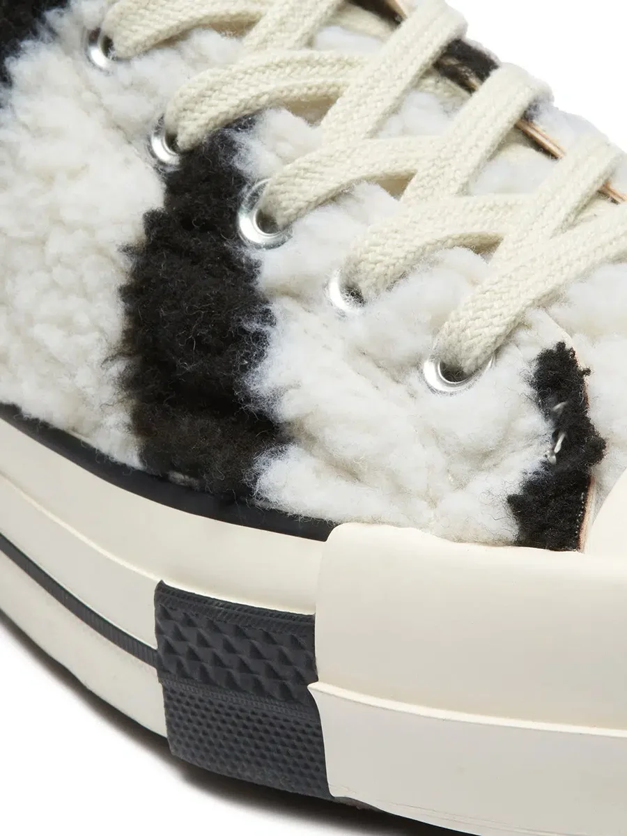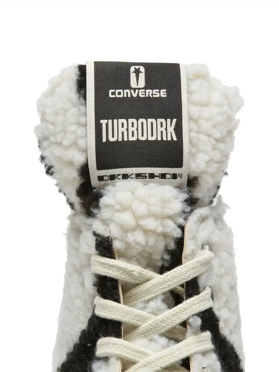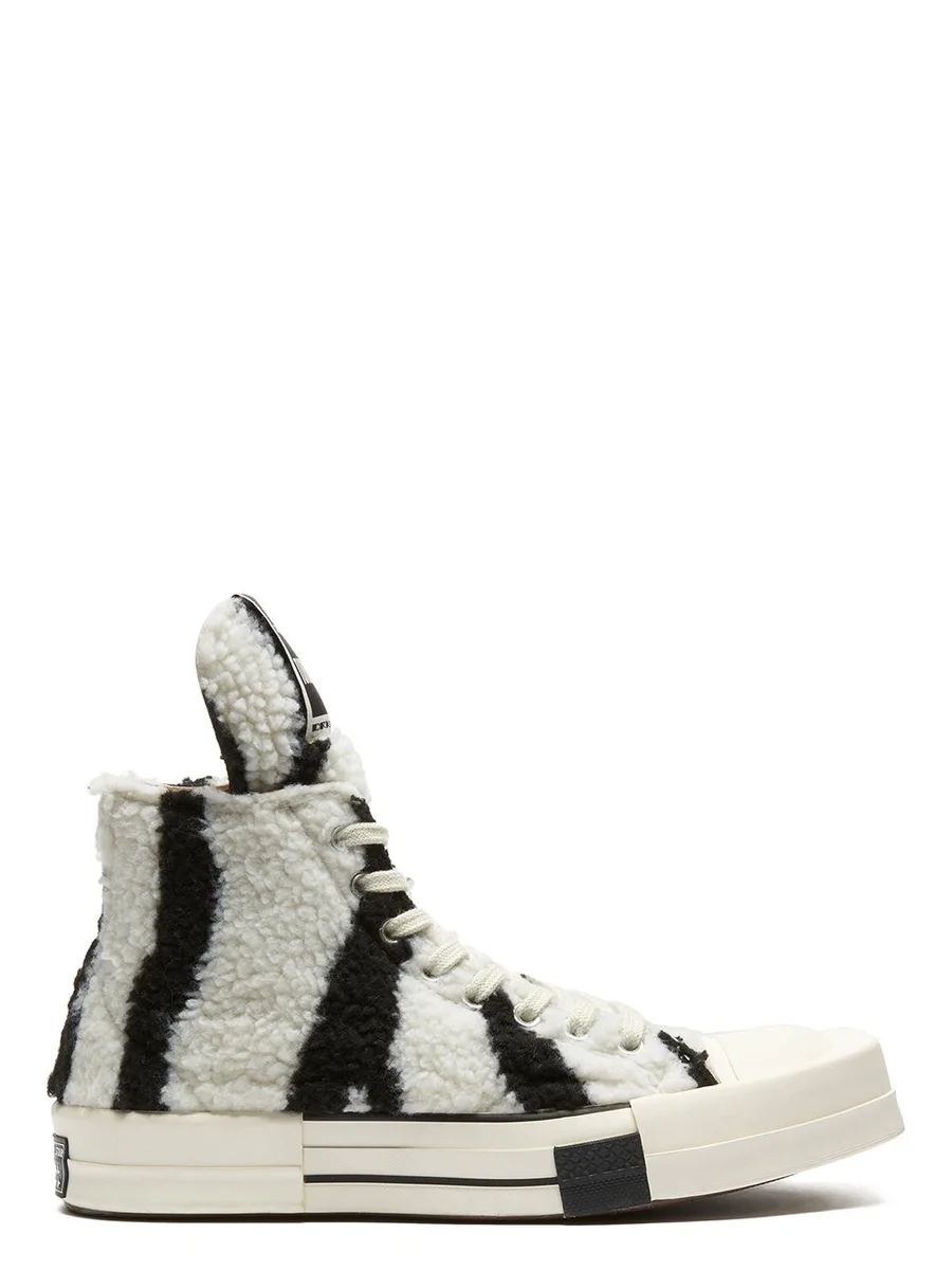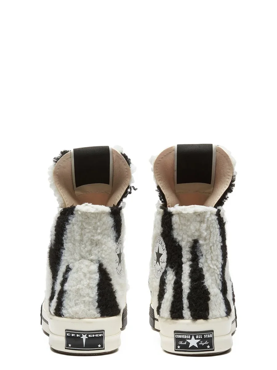 THESE CONVERSE X DRKSHDW TURBODRK HI ARE ZEBRA-INSPIRED FAUX SHEARLING, LACED HIGH TOP SHOES, BASED ON THE CLASSIC CONVERSE 70’S CHUCKS. THEY FEATURE A SIGNATURE DRKSHDW ELONGATED TONGUE WITH A CUSTOM BRANDED WRAP AROUND WOVEN LABEL BEARING THE MODEL NAME. THEY HAVE CONTRAST STITCHING AND LACES, FAUX SUEDE LEATHER LINING AND A SIGNATURE RICK OWENS MOLDED RUBBER HEEL AND MOLDED RUBBER TOE CAP, SUPERIMPOSED ONTO THE CLASSIC 70’S CHUCKS RUBBER SOLE.