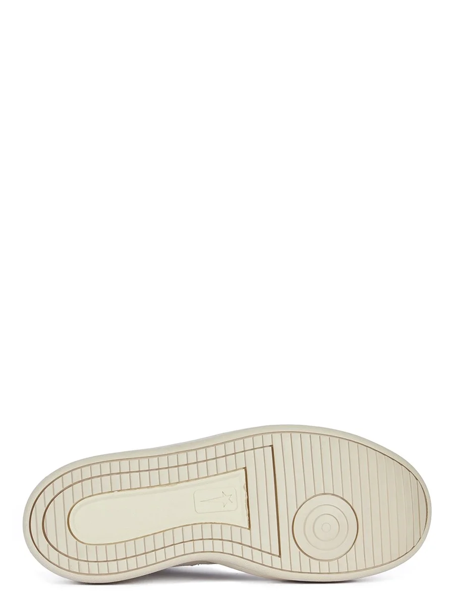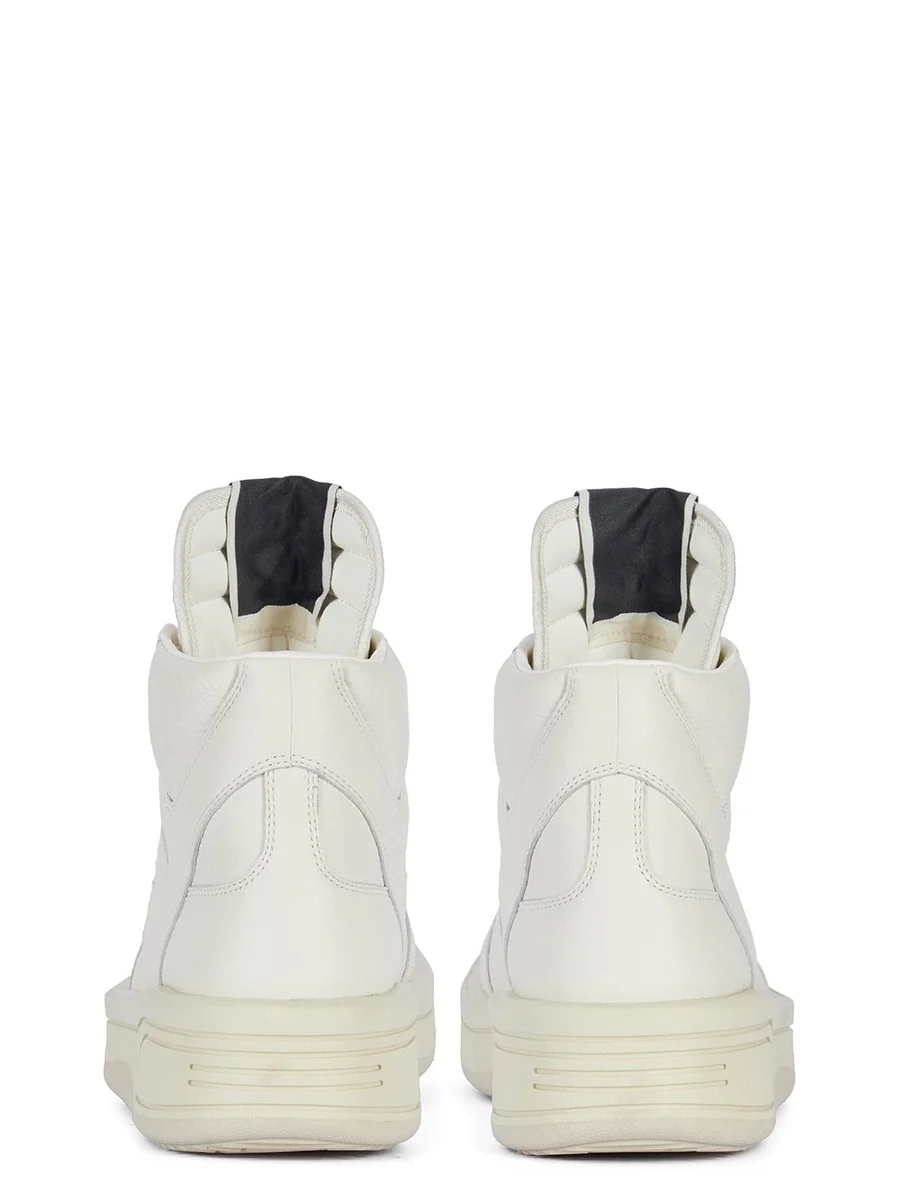 MAGIC JOHNSON. IT HAS THE SIGNATURE DRKSHDW ELONGATED TONGUE WITH CUSTOM BRANDED WRAP AROUND WOVEN LABEL, BEARING THE MODEL NAME, A WHITE LEATHER UPPER, WHITE SOLE AND OUTSOLE.