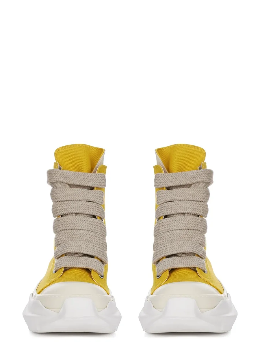 THESE JUMBOLACE ABSTRACT SNEAKS ARE ABOVE ANKLE HEIGHT AND FEATURE SEVEN LARGE EYELETS AND JUMBO LACES, TOE CAPS AND A VOLUMINOUS RUBBER ABSTRACT SOLE.