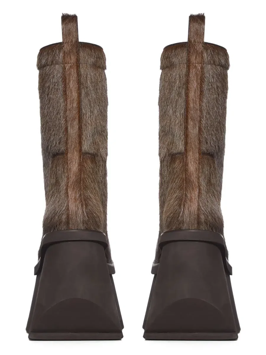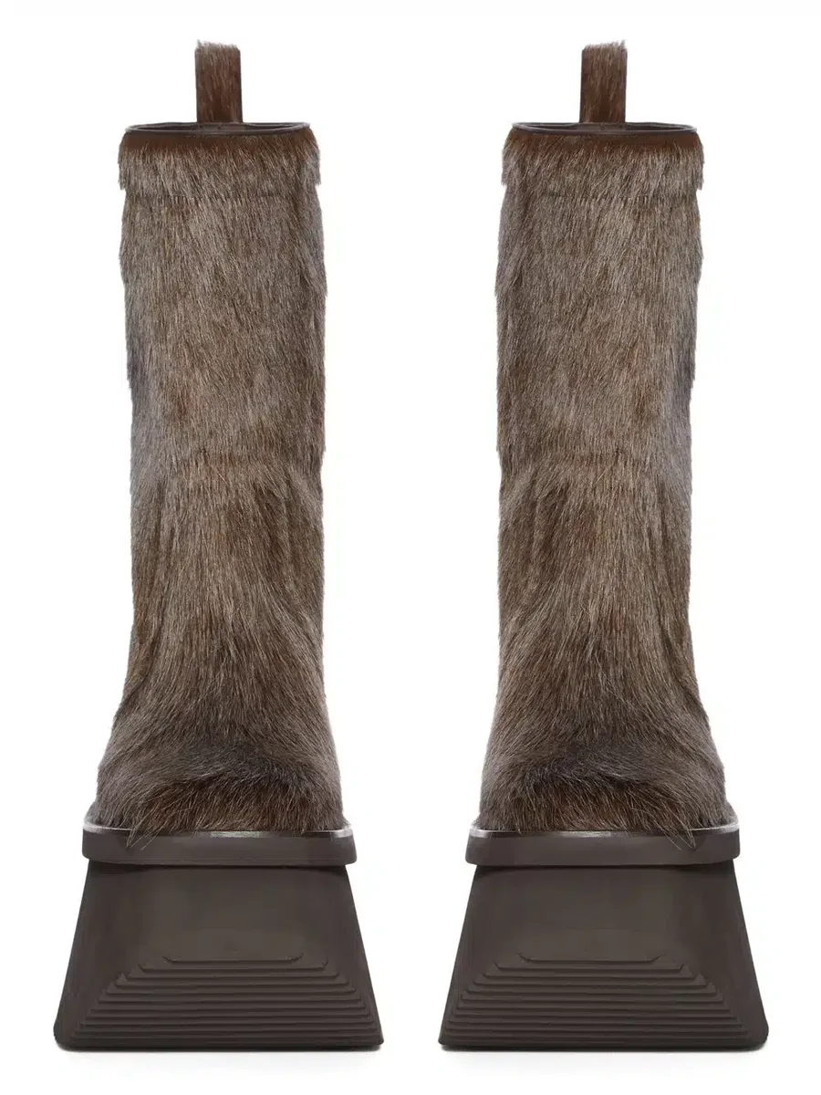 THESE FACTORY BOOTS ARE MID-CALF HEIGHT. THEY HAVE A TOPSTITCHED SEAM ARCING OVER THE FRONT FOOT WITH STITCHING RUNNING OVER THE ANTERIOR ANKLE. THEY FEATURE AN ANGULAR HEEL COUNTER AND A BACK LOOP PULL TAB AND HAVE 14CM HIGH SHARK-TOOTH SOLE UNDERNEATH AND AT FRONT AND HAVE A SLANTING HEEL AND INCLINED TOE PLATFORM.