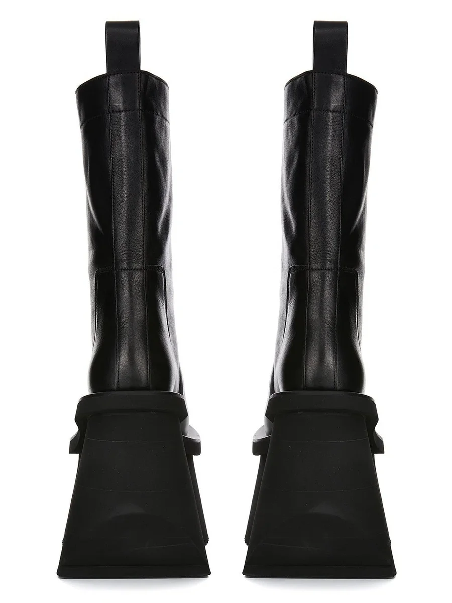 THESE FACTORY BOOTS ARE MID-CALF HEIGHT. THEY HAVE A TOPSTITCHED SEAM ARCING OVER THE FRONT FOOT WITH STITCHING RUNNING OVER THE ANTERIOR ANKLE. THEY FEATURE AN ANGULAR HEEL COUNTER AND A BACK LOOP PULL TAB AND HAVE 14CM HIGH SHARK-TOOTH SOLE UNDERNEATH AND AT FRONT AND HAVE A SLANTING HEEL AND INCLINED TOE PLATFORM.