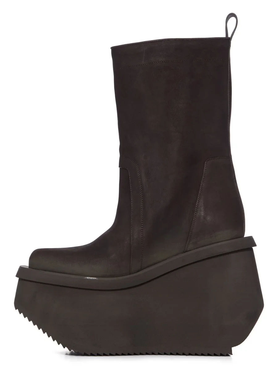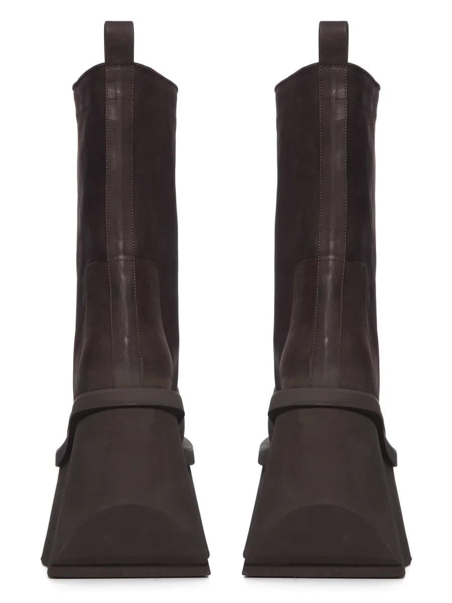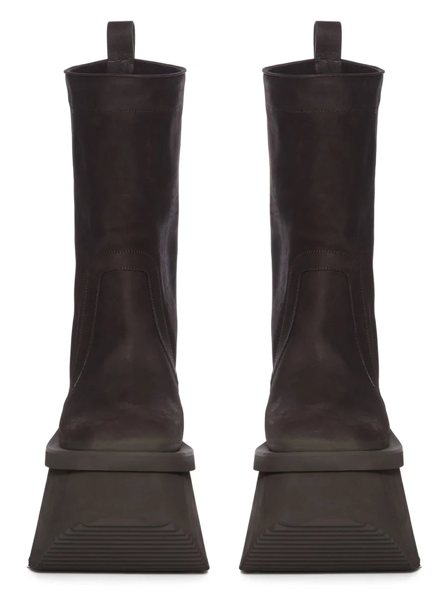 THESE FACTORY BOOTS ARE MID-CALF HEIGHT. THEY HAVE A TOPSTITCHED SEAM ARCING OVER THE FRONT FOOT WITH STITCHING RUNNING OVER THE ANTERIOR ANKLE. THEY FEATURE AN ANGULAR HEEL COUNTER AND A BACK LOOP PULL TAB AND HAVE 14CM HIGH SHARK-TOOTH SOLE UNDERNEATH AND AT FRONT AND HAVE A SLANTING HEEL AND INCLINED TOE PLATFORM.