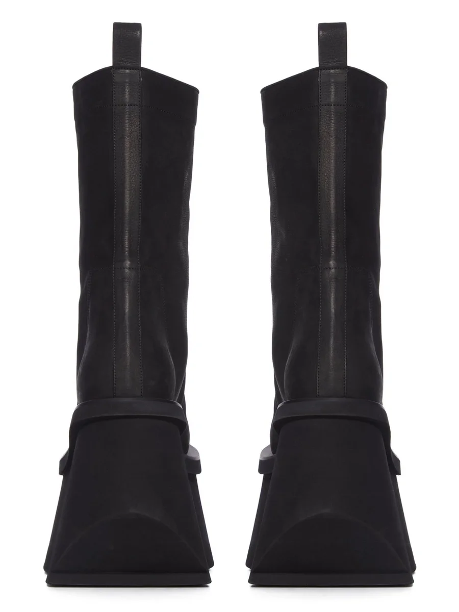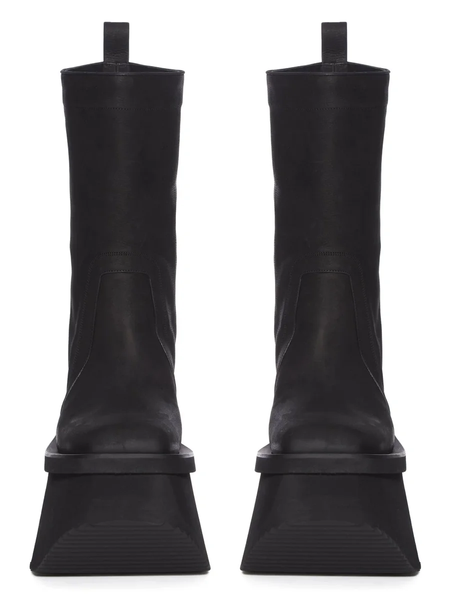THESE FACTORY BOOTS ARE MID-CALF HEIGHT. THEY HAVE A TOPSTITCHED SEAM ARCING OVER THE FRONT FOOT WITH STITCHING RUNNING OVER THE ANTERIOR ANKLE. THEY FEATURE AN ANGULAR HEEL COUNTER AND A BACK LOOP PULL TAB AND HAVE 14CM HIGH SHARK-TOOTH SOLE UNDERNEATH AND AT FRONT AND HAVE A SLANTING HEEL AND INCLINED TOE PLATFORM.