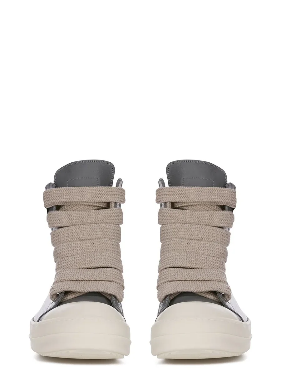 THESE JUMBOLACE SNEAKERS ARE ABOVE-ANKLE HEIGHT AND FEATURE EYELETS, JUMBO LACES, A ZIPPER ON THE INSIDE ANKLE FOR EASY FASTENING, TOE CAPS AND SHARK-TOOTHED BUMPER SOLES.