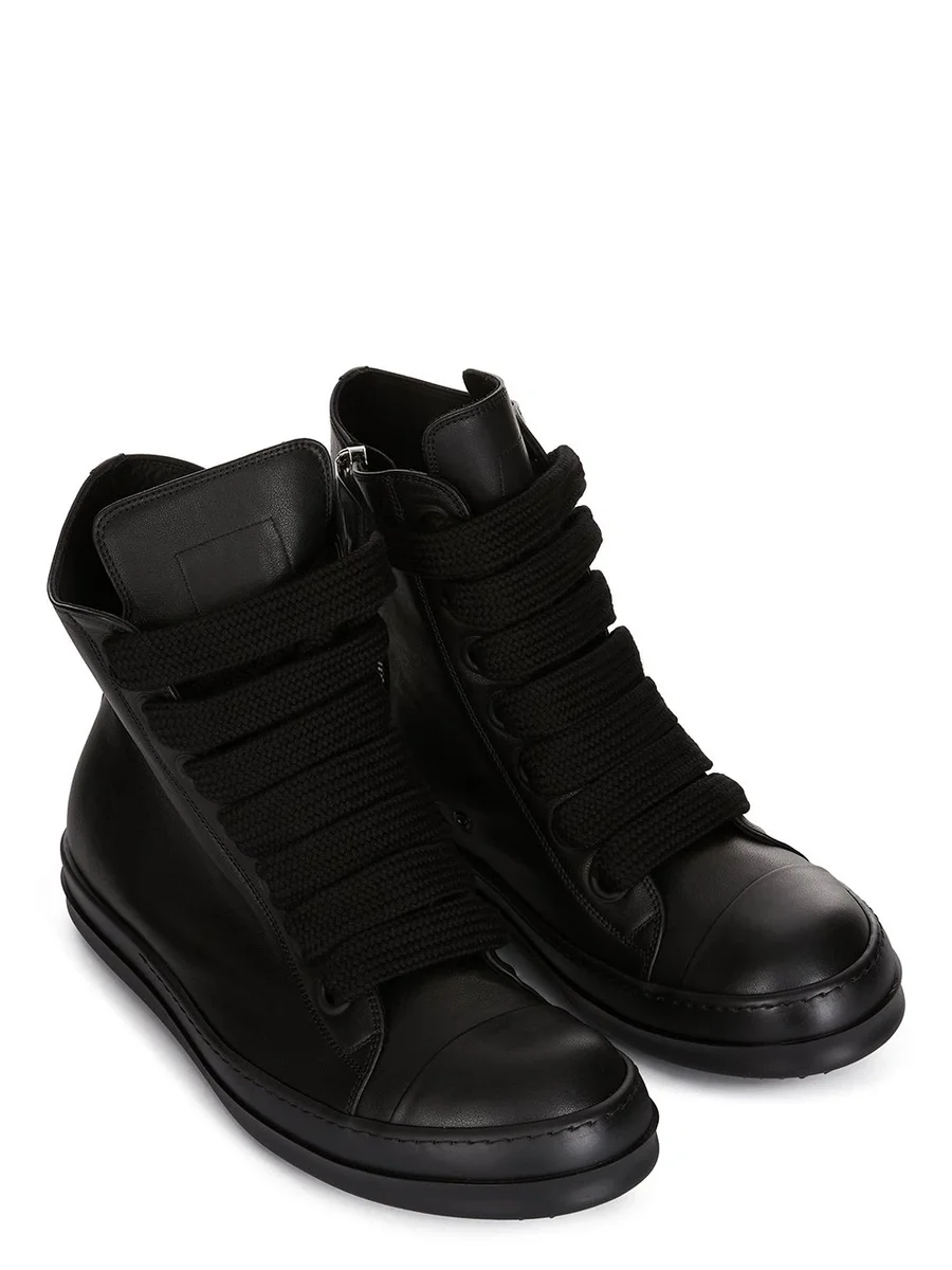 THESE JUMBOLACE SNEAKERS ARE ABOVE-ANKLE HEIGHT AND FEATURE EYELETS, JUMBO LACES, A ZIPPER ON THE INSIDE ANKLE FOR EASY FASTENING, TOE CAPS AND SHARK-TOOTHED BUMPER SOLES.
