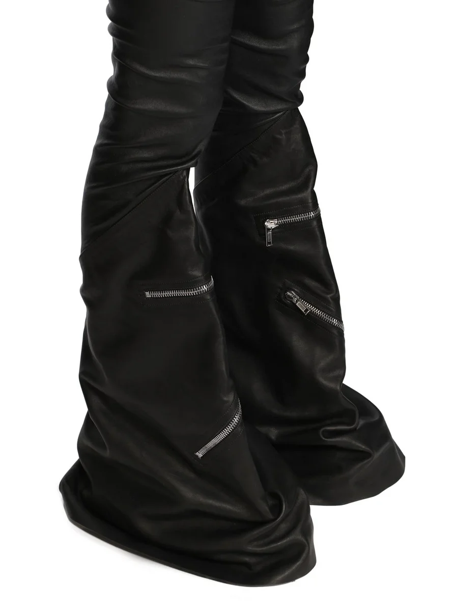 THESE CARGO FETISH SNEAKS ARE ABOVE-KNEE HIGH WITH A STRETCH LEATHER TOP. THEY HAVE A BOOT SHAPED UPPER WITH AN ADDITIONAL LAYER FALLING FROM AN ASYMMETRICAL SEAM LINE, GRAZING THE FLOOR. THEY FEATURE TWO FRONT ZIPPERS, ONE HORIZONTAL AND ON ANGLED. THEY HAVE MILK TOE CAPS AND SHARK TOOTH SOLES.