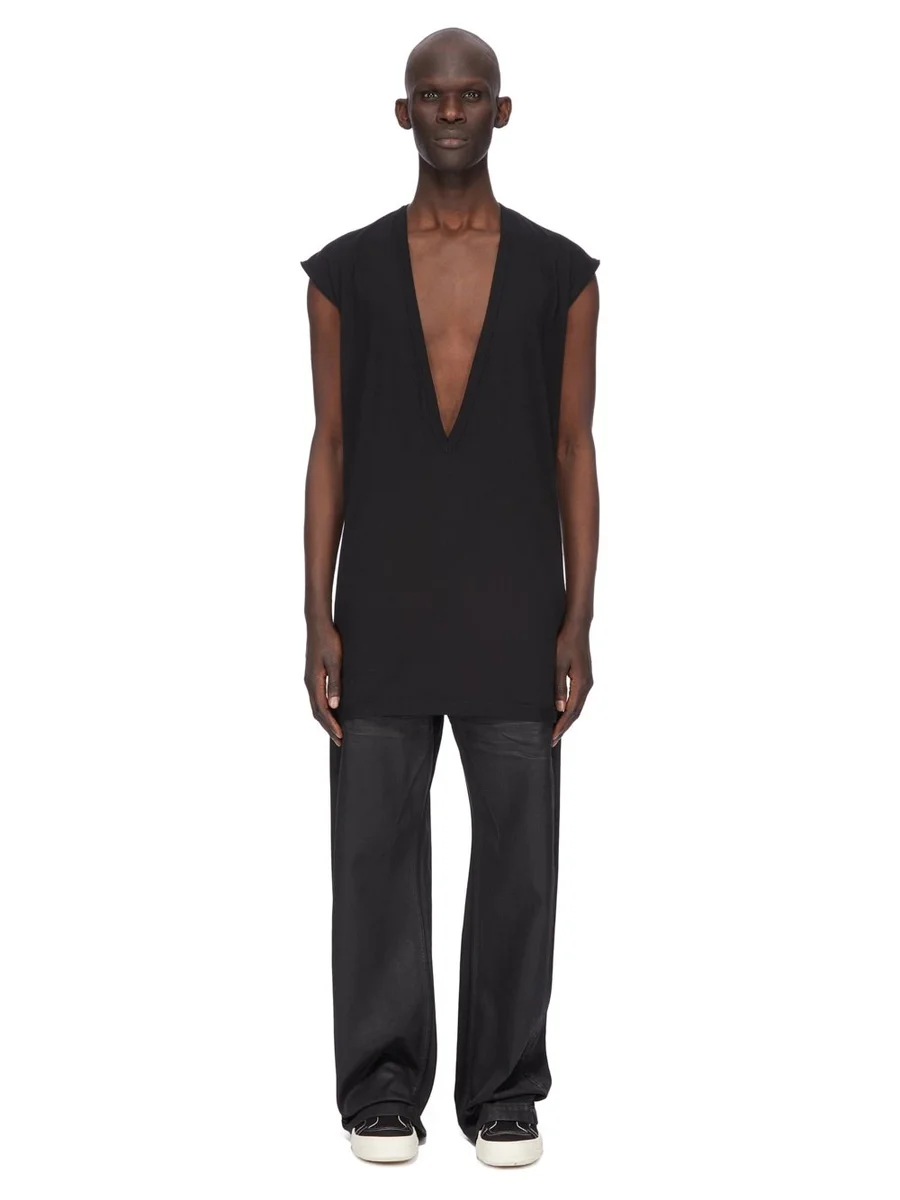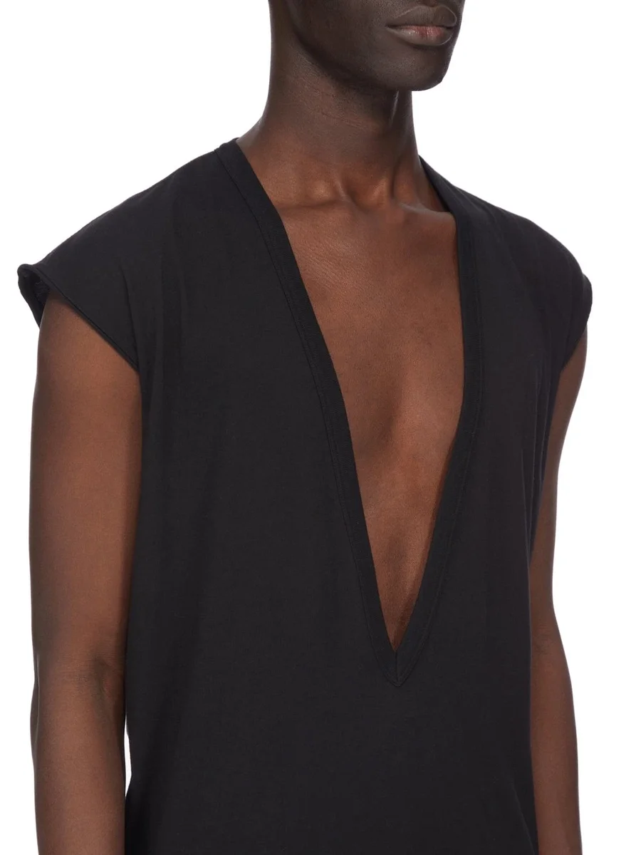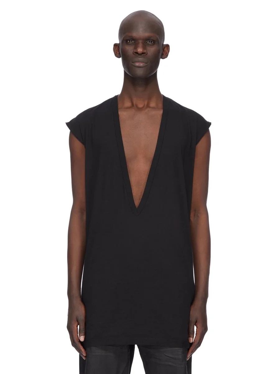 THIS DYLAN T IS BELOW HIP LENGTH, IT HAS AN EXTREME DEEP V NECK WITH WIDE TANK SHOULDERS WITH REINFORCED RAW CUT ARMHOLES. IT FEATURES THE SIGNATURE SINGLE SEAM RUNNING DOWN THE CENTRE BACK SPINE.
