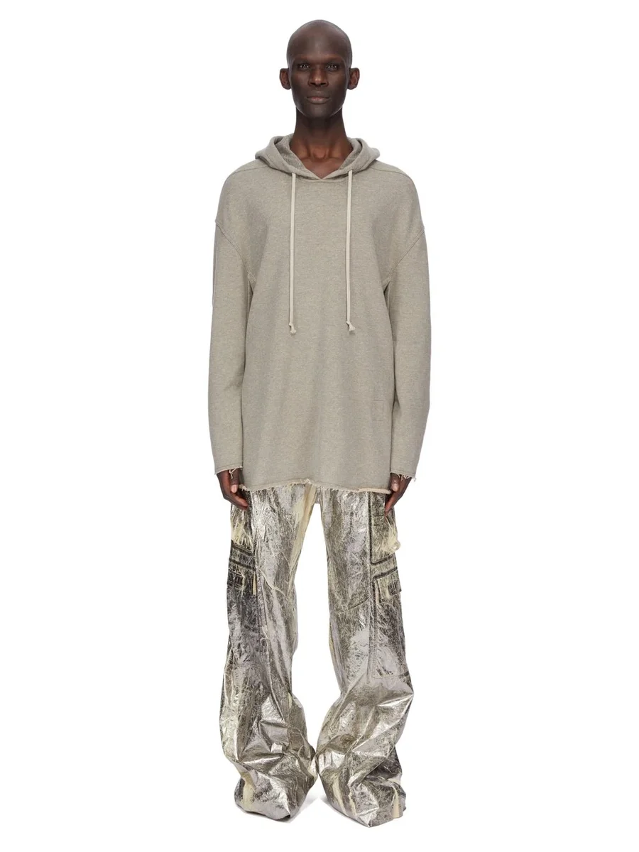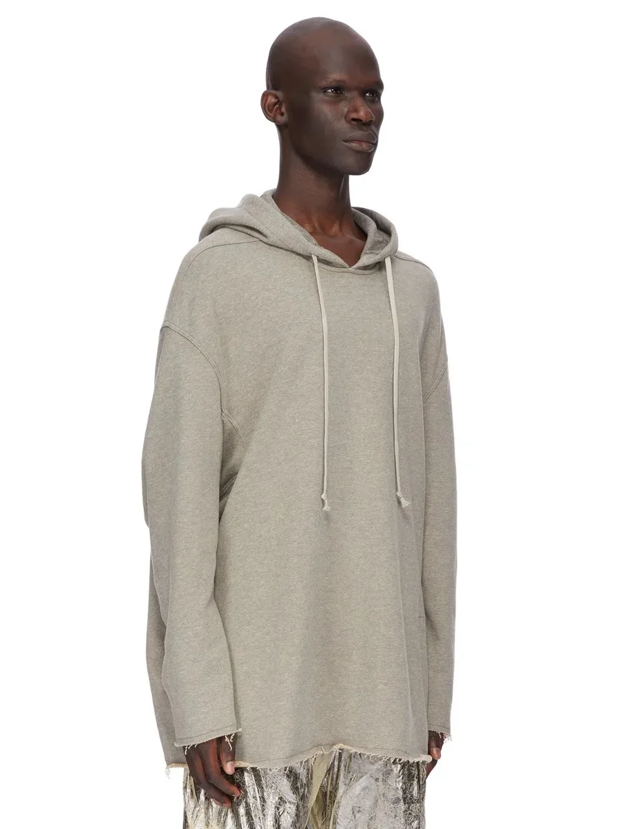 THIS PETER HOODIE IS HIP LENGTH, DIPPING SLIGHTLY AT THE BACK, WITH AN OVERSIZE FIT. IT HAS LONG SLEEVES WITH LOW SHOULDERS, A DROPPED ARMHOLE, A HOOD WITH DRAWSTRING AND RAW CUT HEMS. IT FEATURES A YOKE AND DIAGONAL SEAMS WITH TOPSTITCHING ON THE FRONT AND BACK BODY.