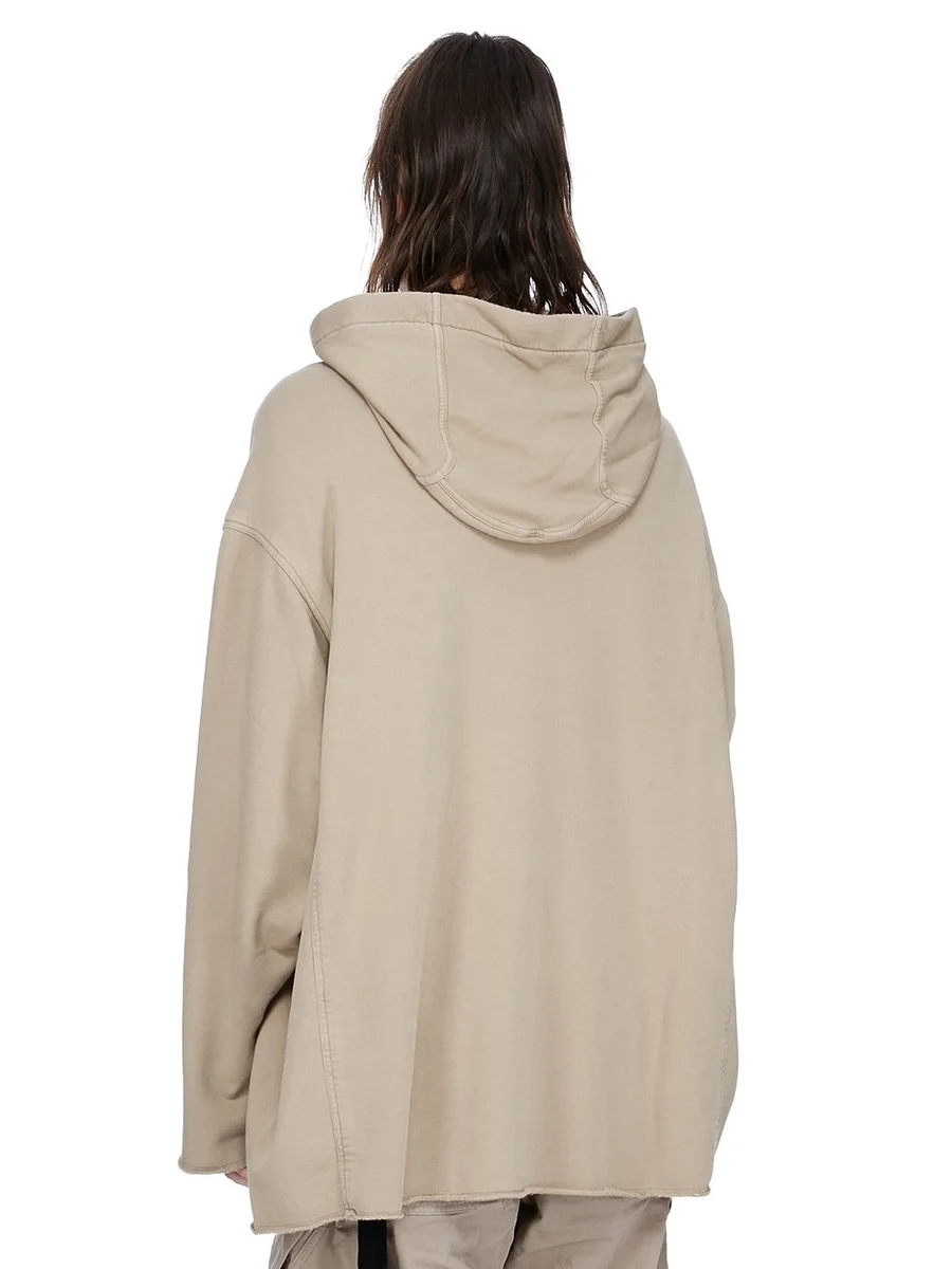 THIS PETER HOODIE IS HIP LENGTH, DIPPING SLIGHTLY AT THE BACK, WITH AN OVERSIZE FIT. IT HAS LONG SLEEVES WITH LOW SHOULDERS, A DROPPED ARMHOLE, A HOOD WITH DRAWSTRING AND RAW CUT HEMS. IT FEATURES A YOKE AND DIAGONAL SEAMS WITH TOPSTITCHING ON THE FRONT AND BACK BODY.