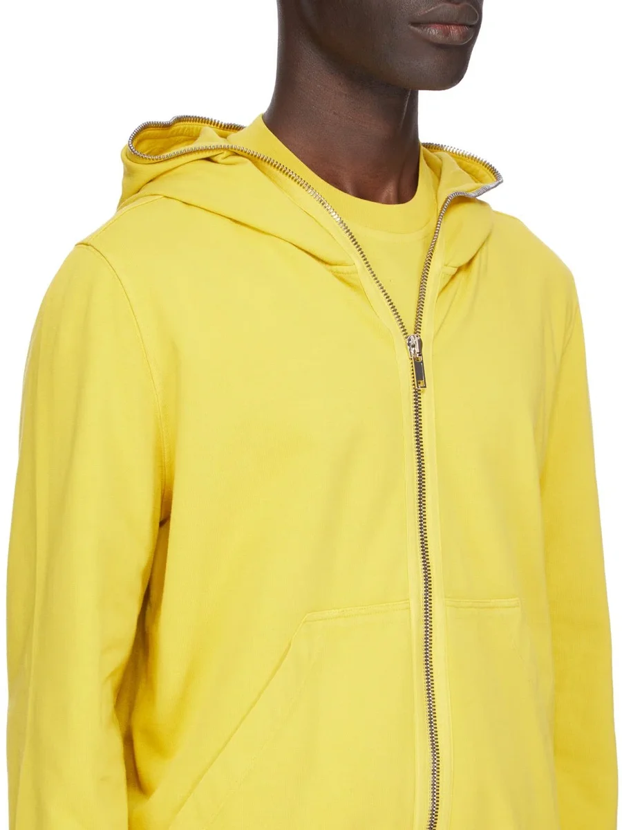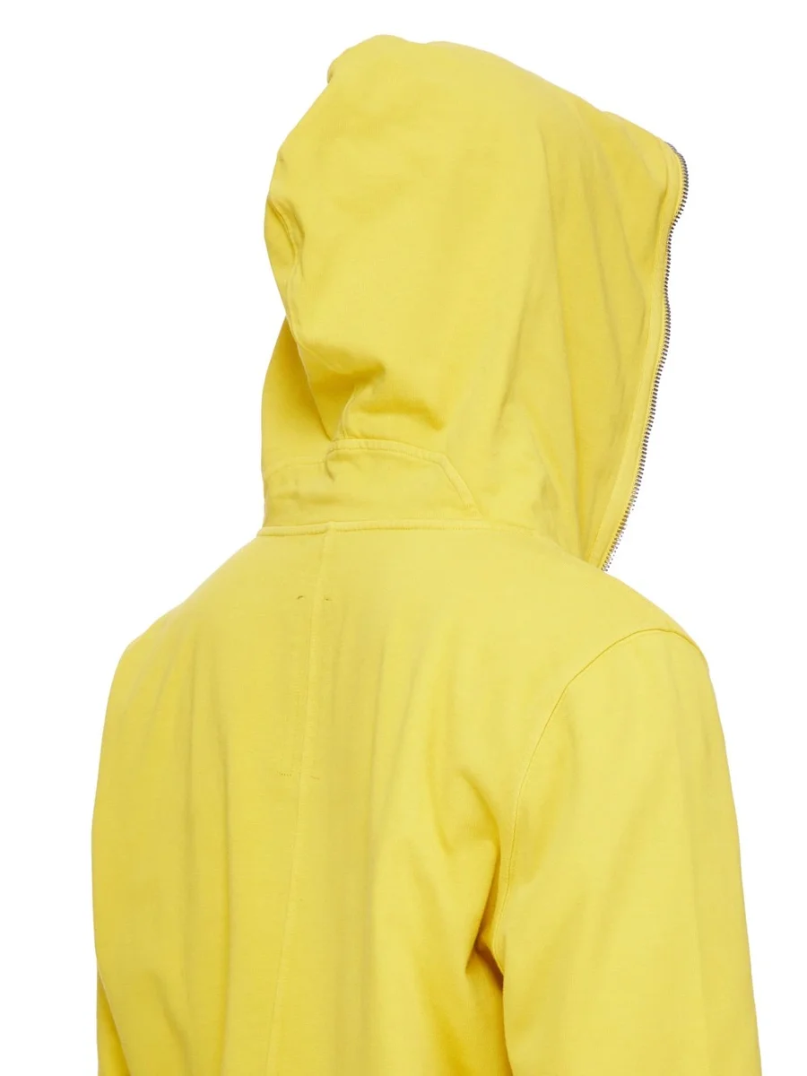 THIS JUMBO GIMP HOODIE IS SLIGHTLY BELOW HIP LENGTH WITH LONG SLEEVES AND LARGE FIT. IT HAS A FRONT ZIPPER CLOSURE WITH EXPOSED ZIPPER TAPE THAT RUNS FROM THE HEM ALL THE WAY UP THROUGH THE HOOD, ALLOWING IT TO BE ZIPPERED COMPLETELY CLOSED OVER THE FACE. IT HAS TWO SIDE FRONT POCKETS, RIBBED CUFFS AND HEM AND A SINGLE SEAM RUNNING DOWN THE CENTRE BACK SPINE.
