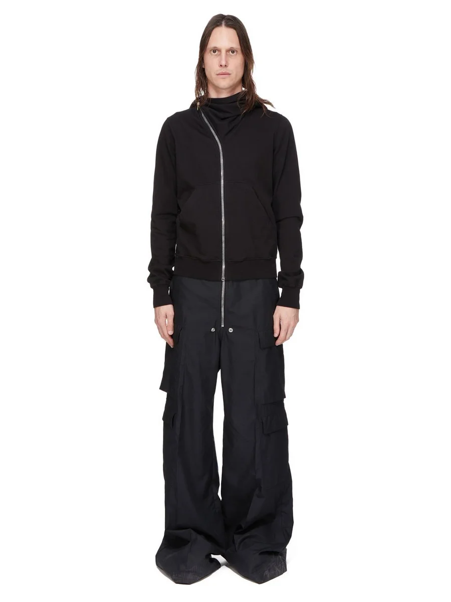 THIS MOUNTAIN HOODIE IS ABOVE HIP LENGTH WITH LONG SLEEVES. IT HAS A CURVED ASYMMETRICAL ZIPPER CLOSURE, A SMALL FUNNEL NECK AND A LARGE POINTED HOOD. IT HAS TWO FRONT PATCH POCKETS, RIBBED CUFFS AND WAISTBAND SIGNATURE SINGLE SEAM RUNNING DOWN THE CENTRE BACK SPINE.