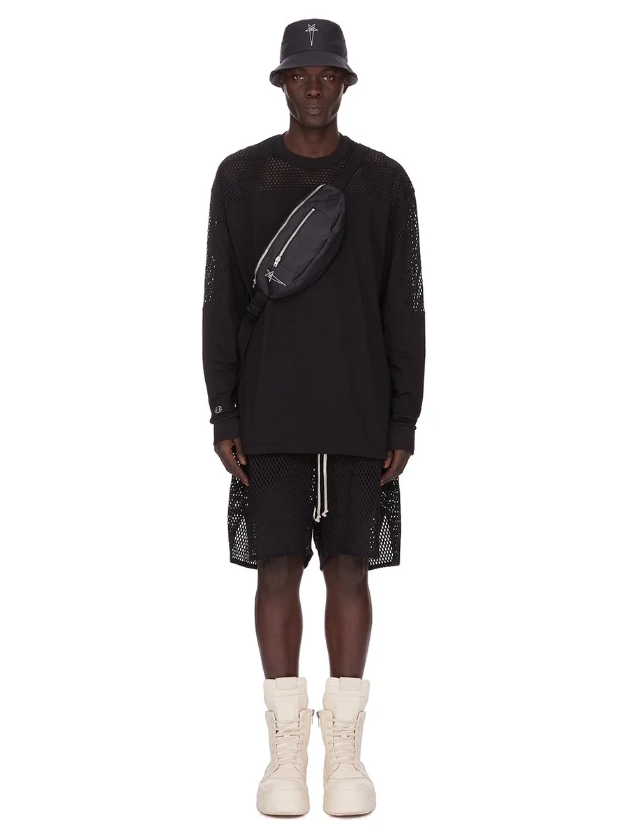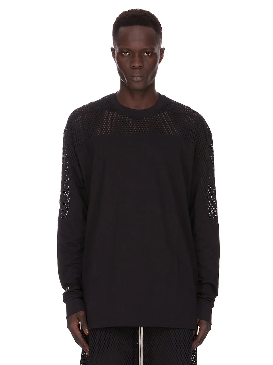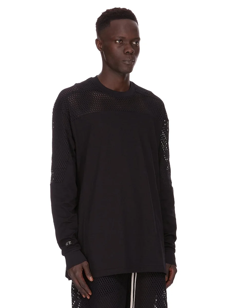 CHAMPION X RICK OWENS SS25 GIRDERED T IN BLACK COTTON JERSEY AND OPEN MESH JERSEY