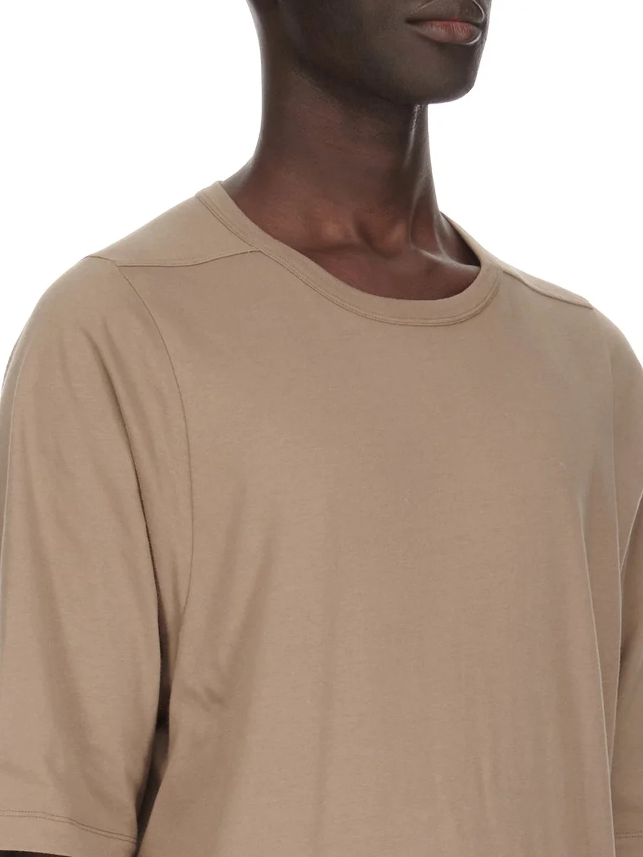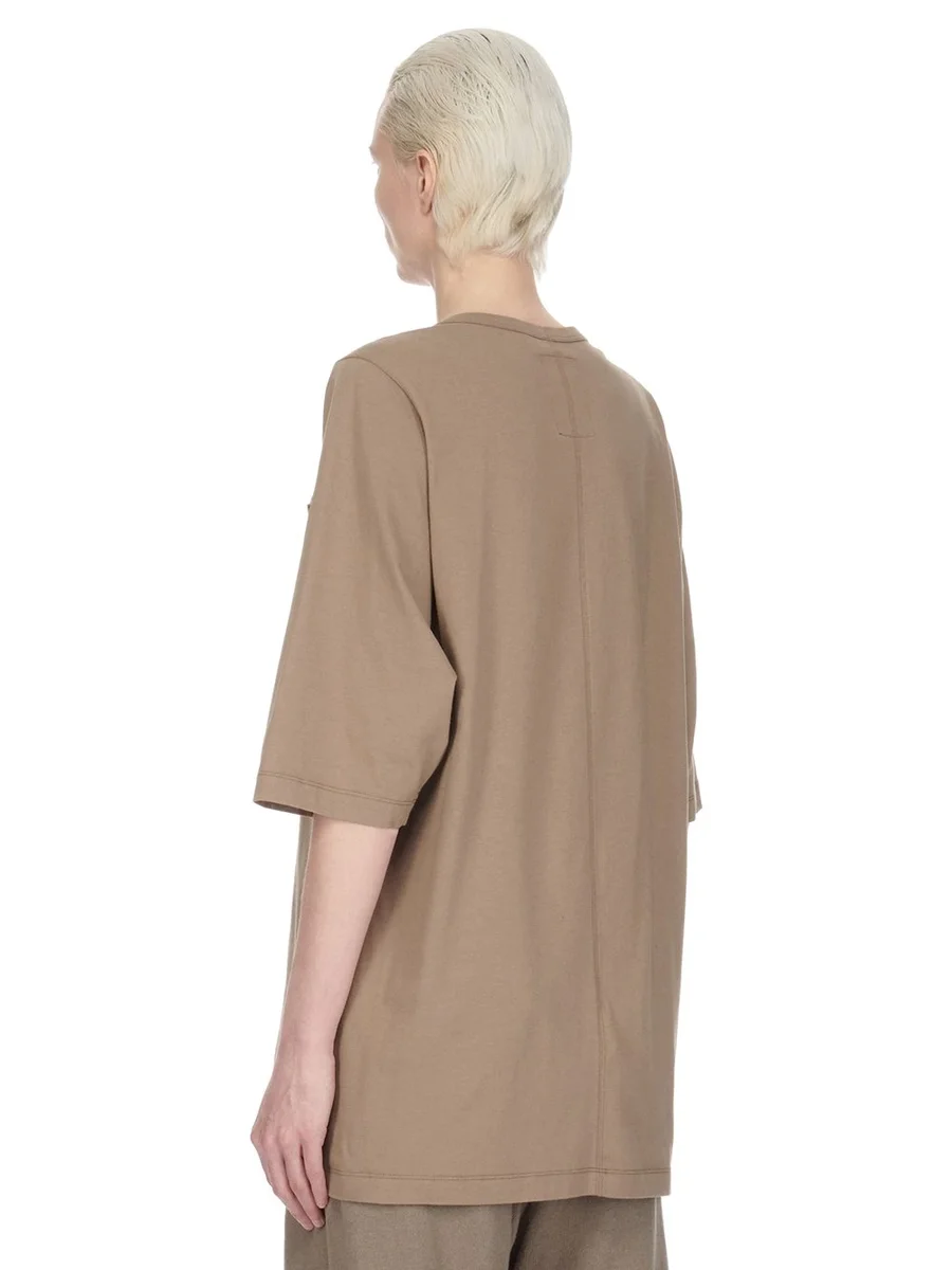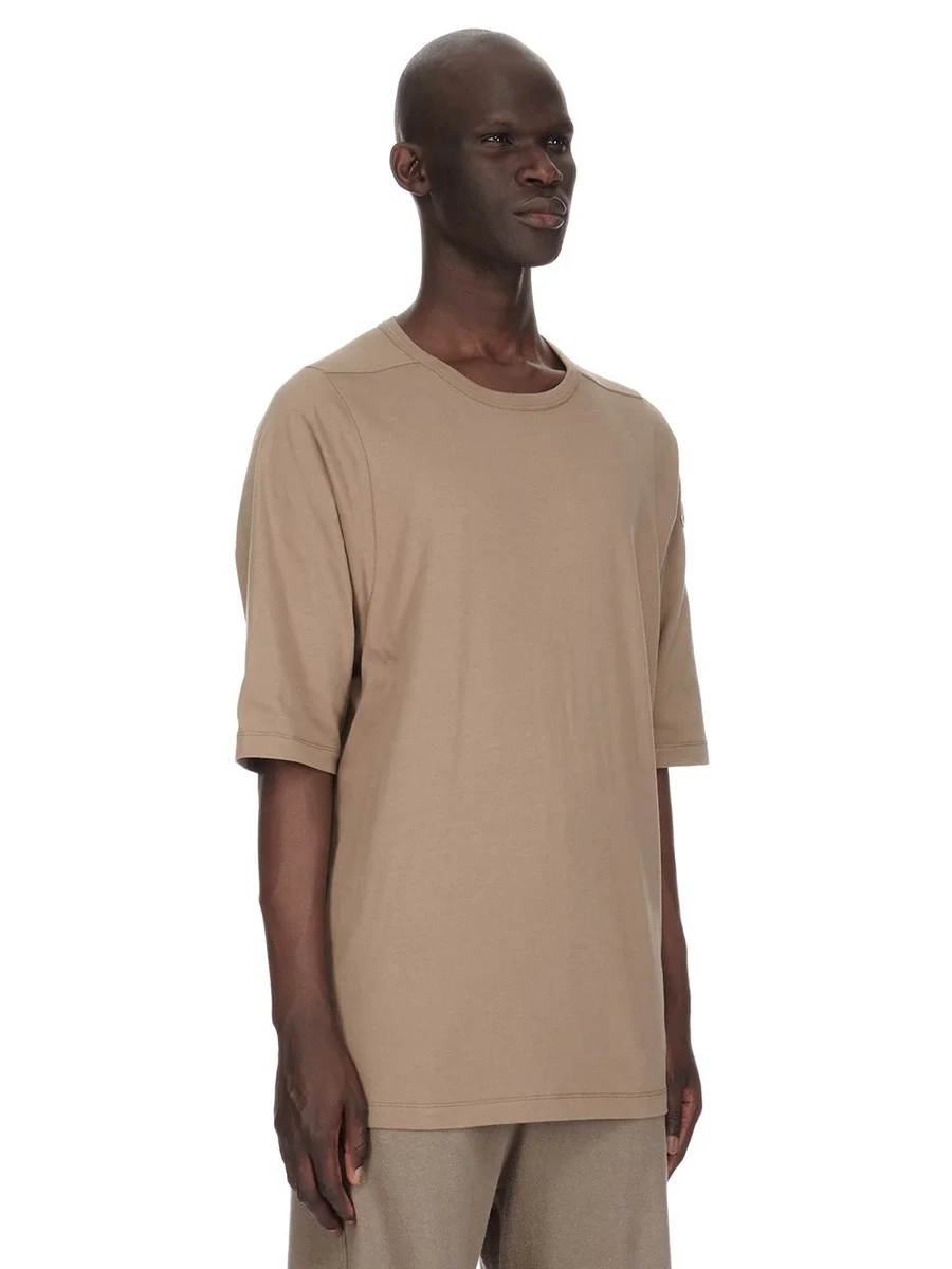 THIS CREWNECK SS T IS HIP LENGTH WITH ELBOW LENGTH SHORT SLEEVES. IT HAS A RIBBED ROUND NECK AND LEVEL SHOULDER SEAMS. IT FEATURES THE SIGNATURE SINGLE SEAM RUNNING DOWN THE CENTRE BACK SPINE. IT HAS THE MONCLER +RICK OWENS EMBROIDERED LOGO PATCH ON THE UPPER LEFT ARM.