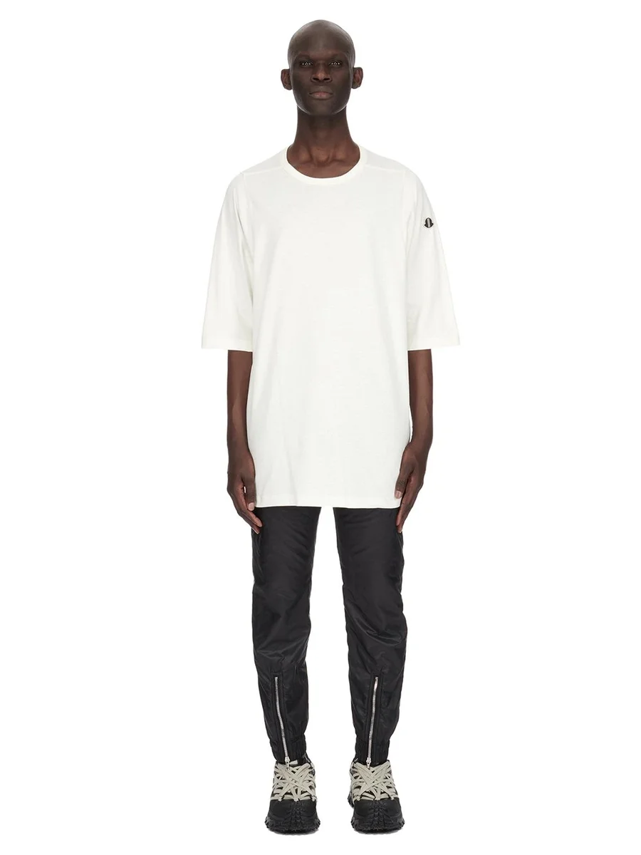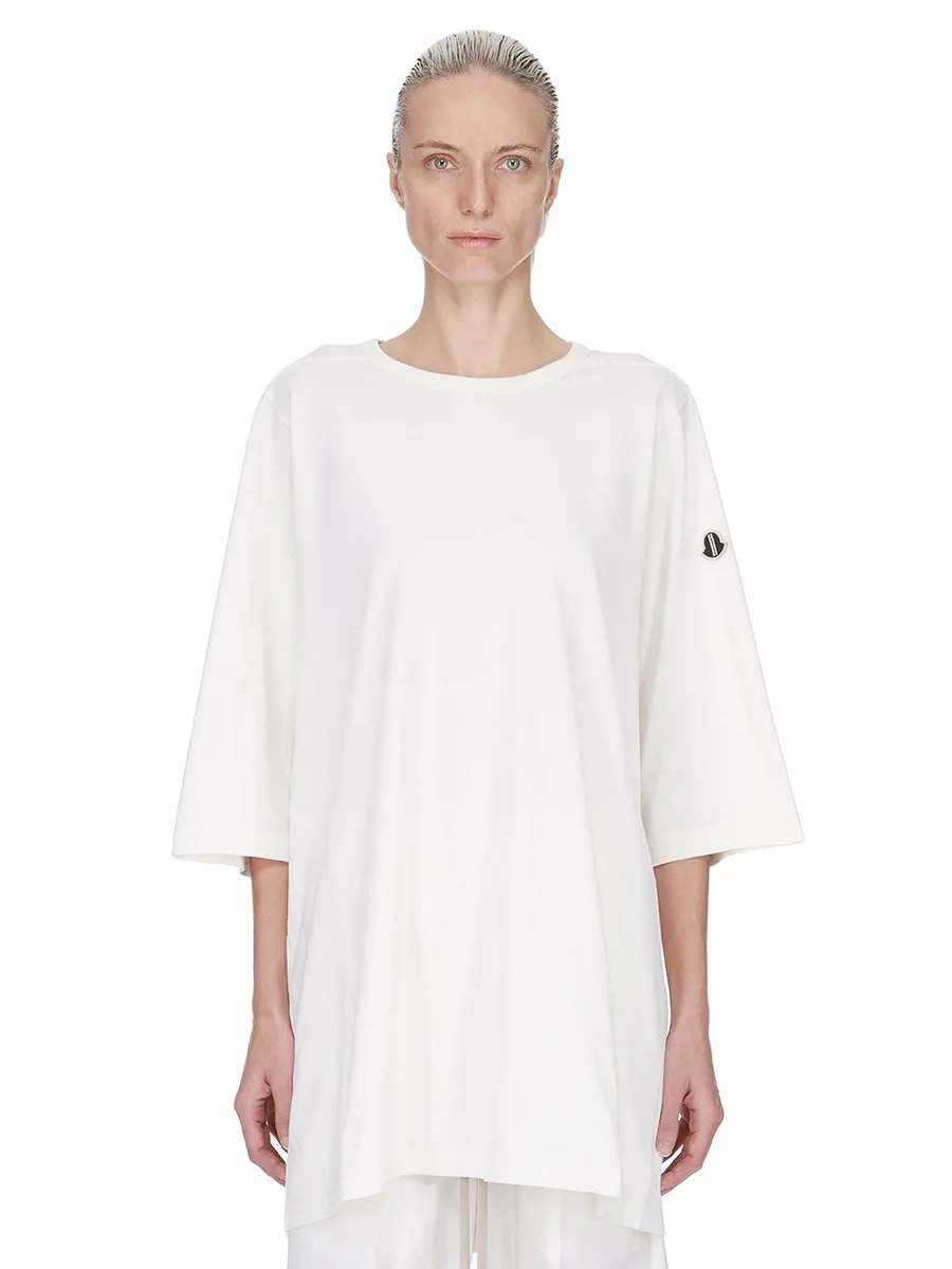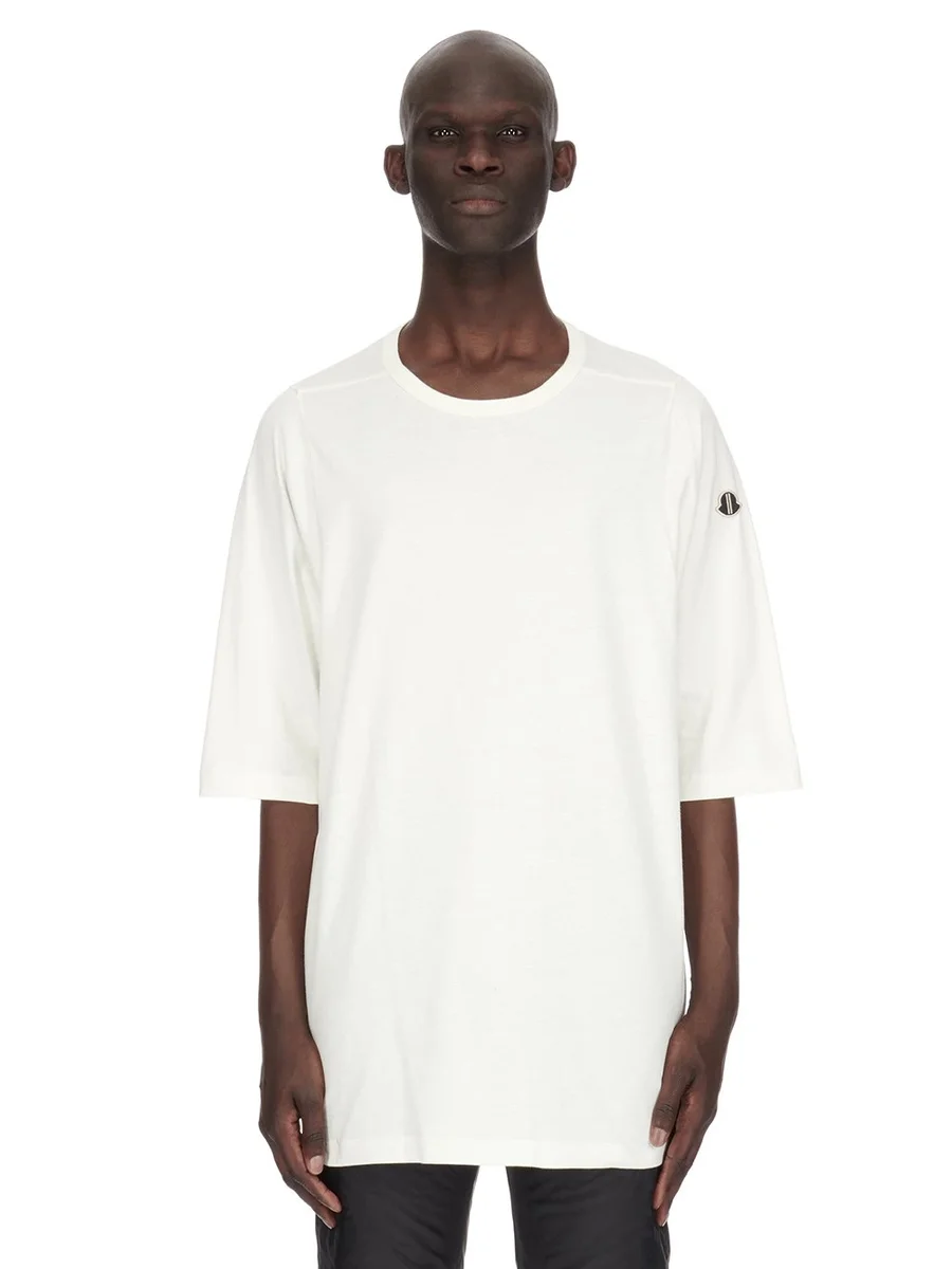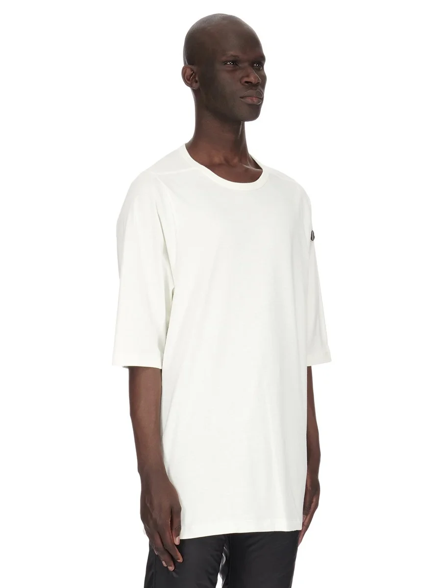 THIS CREWNECK SS T IS HIP LENGTH WITH ELBOW LENGTH SHORT SLEEVES. IT HAS A RIBBED ROUND NECK AND LEVEL SHOULDER SEAMS. IT FEATURES THE SIGNATURE SINGLE SEAM RUNNING DOWN THE CENTRE BACK SPINE. IT HAS THE MONCLER +RICK OWENS EMBROIDERED LOGO PATCH ON THE UPPER LEFT ARM.