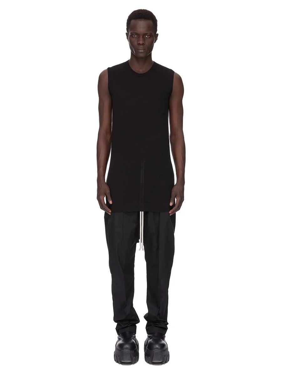 THIS BASIC SL T IS BELOW HIP LENGTH AND SLEEVELESS. IT HAS A RIBBED ROUND NECK, RAW CUT HEM AND REINFORCED RAW SHOULDERS. IT FEATURES THE SIGNATURE SINGLE SEAM RUNNING DOWN THE CENTRE BACK SPINE.