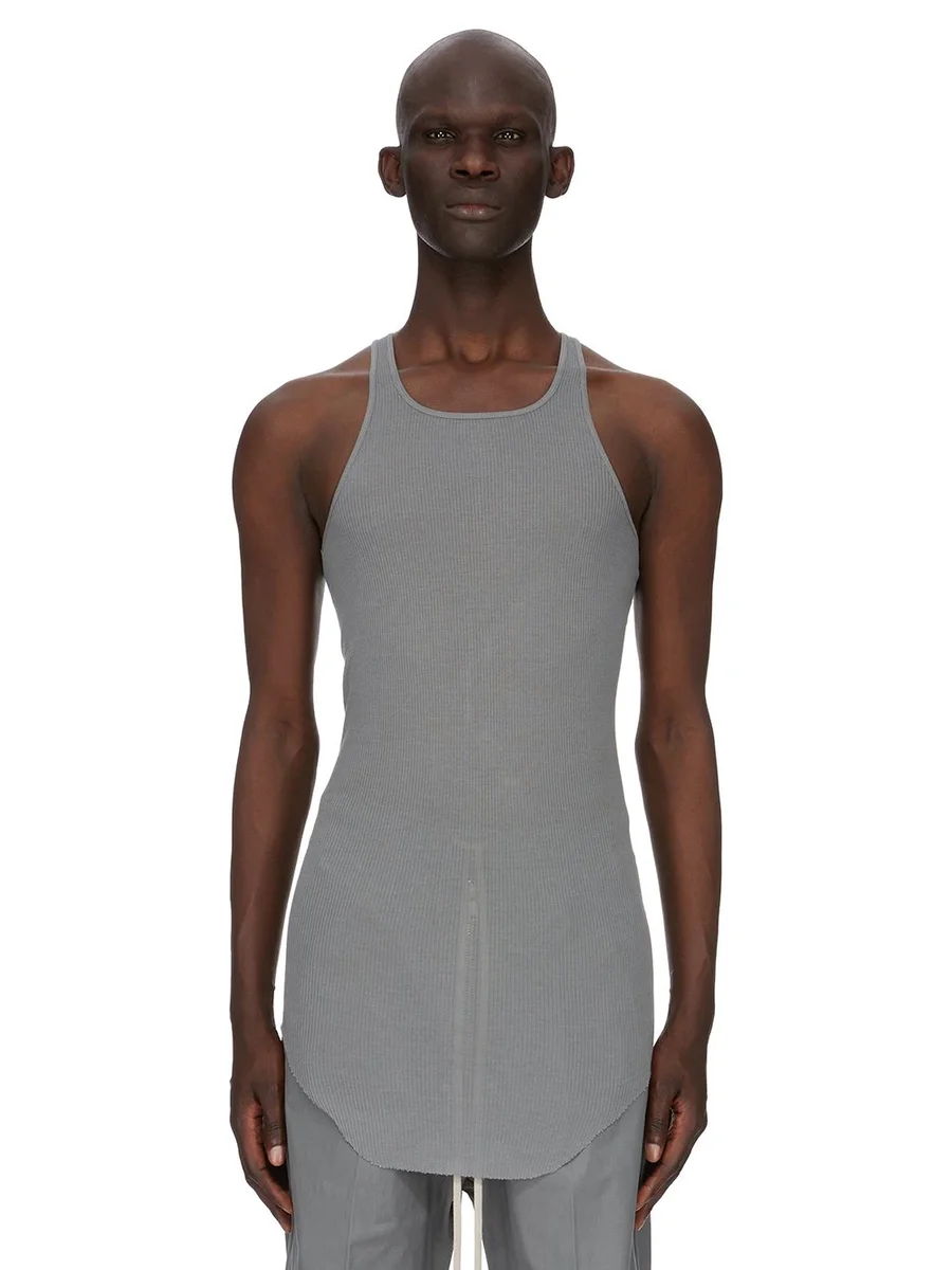 THIS BASIC RIB TANK IS HIP LENGTH WITH A ROUNDED RAW CUT HEM THAT DIPS IN FRONT AND BACK. IT HAS A ROUND NECKLINE AND THIN SHOULDER STRAPS THAT FLOW INTO A SLIGHT RACER BACK. IT FEATURES THE SIGNATURE SINGLE SEAM RUNNING DOWN THE CENTRE BACK SPINE.