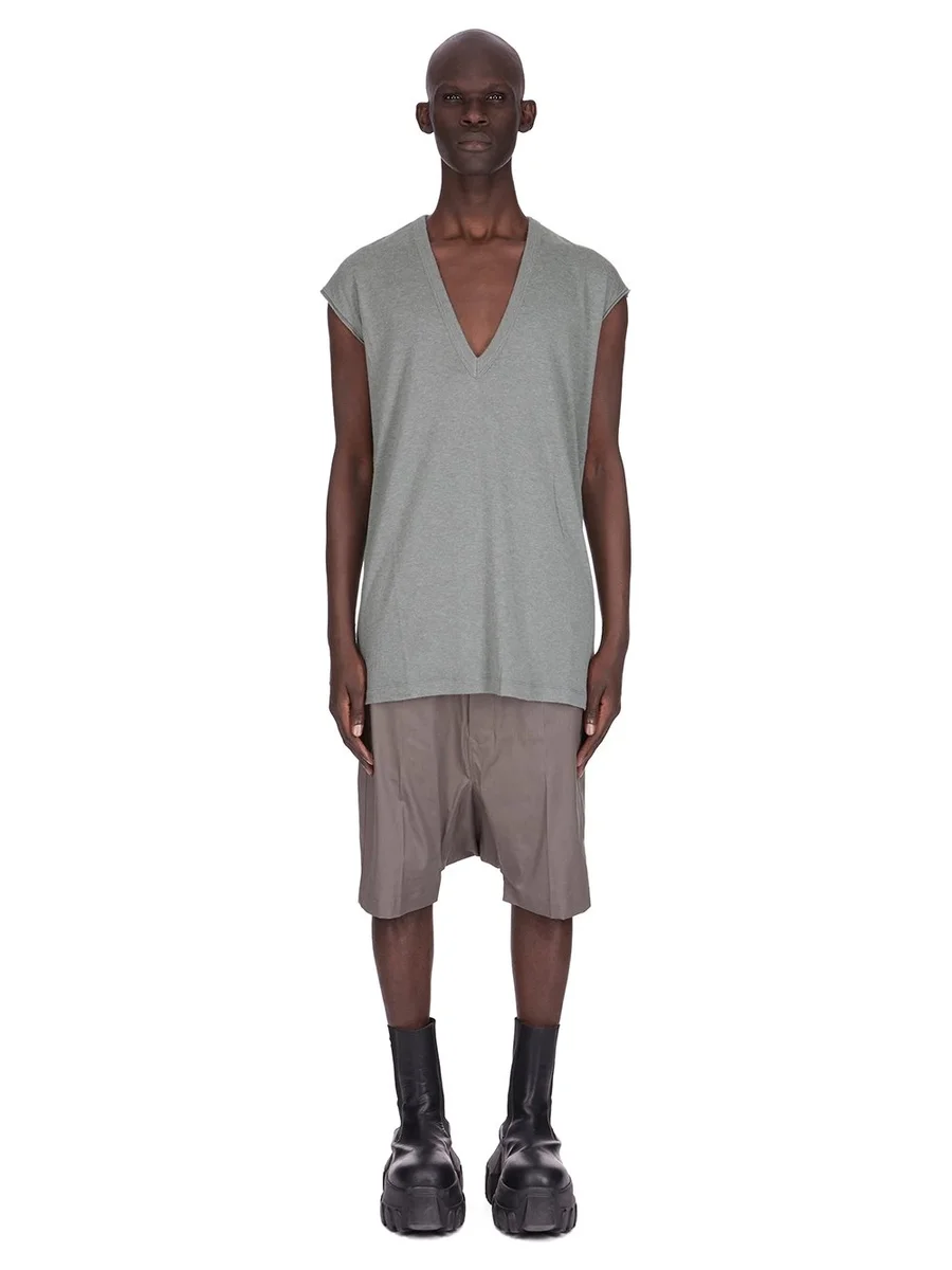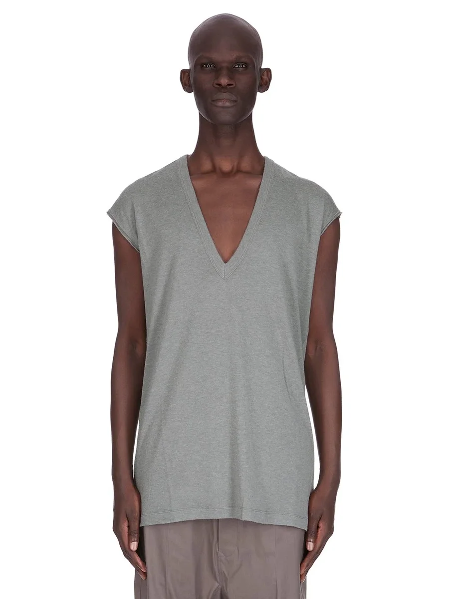 THIS DEEP V SL T IS HIP LENGTH, IT HAS A DEEP V NECK WITH WIDE TANK SHOULDERS WITH REINFORCED RAW CUT ARMS. IT FEATURES THE SIGNATURE SINGLE SEAM RUNNING DOWN THE CENTRE BACK SPINE.
