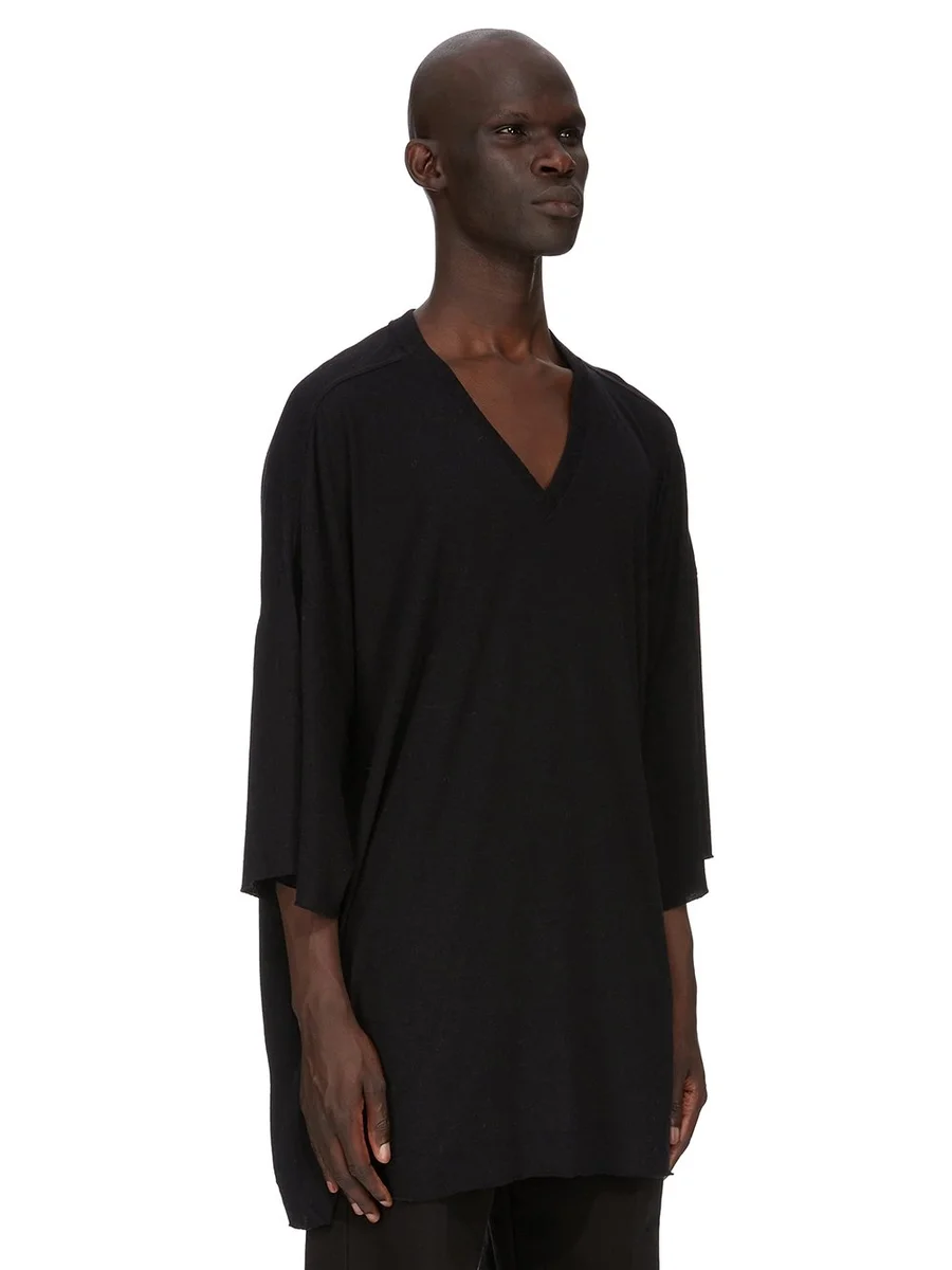 THIS V TOMMY T IS BELOW HIP LENGTH WITH A JUMBO OVERSIZED FIT. IT HAS WIDE SHORT SLEEVES WITH A DROPPED ARMHOLE, RAW CUT HEMS AND A V NECK. IT FEATURES SIGNATURE FRONT LEVEL SHOULDER SEAMS.