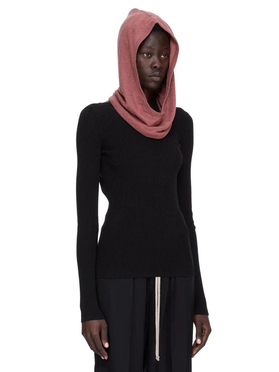 THIS HOOD FITS OVER THE HEAD LIKE A SNOOD WITH AN OPEN FACE, AND A RIBBED EDGE. IT CAN BE WORN AS A HOOD OR DOWN AROUND THE NECK AS A SCARF.