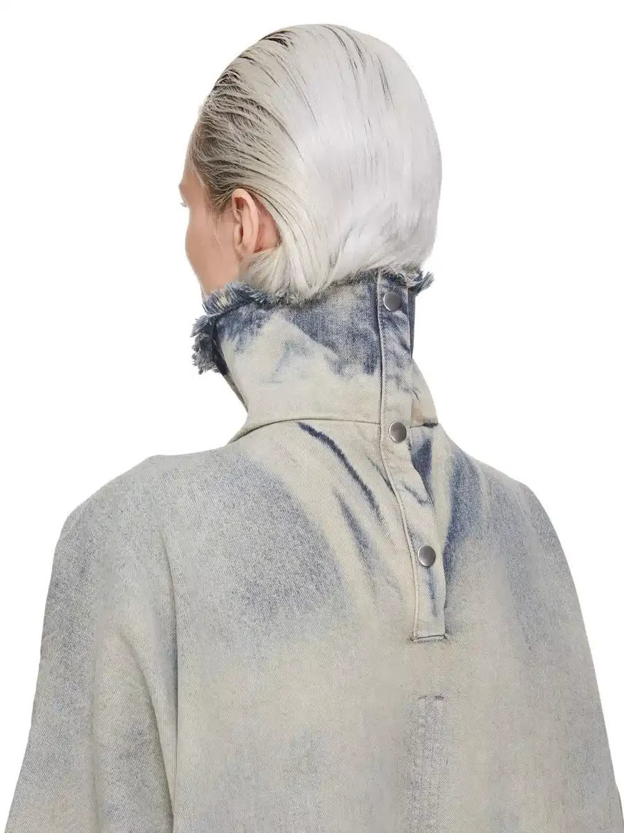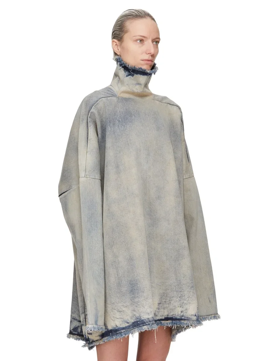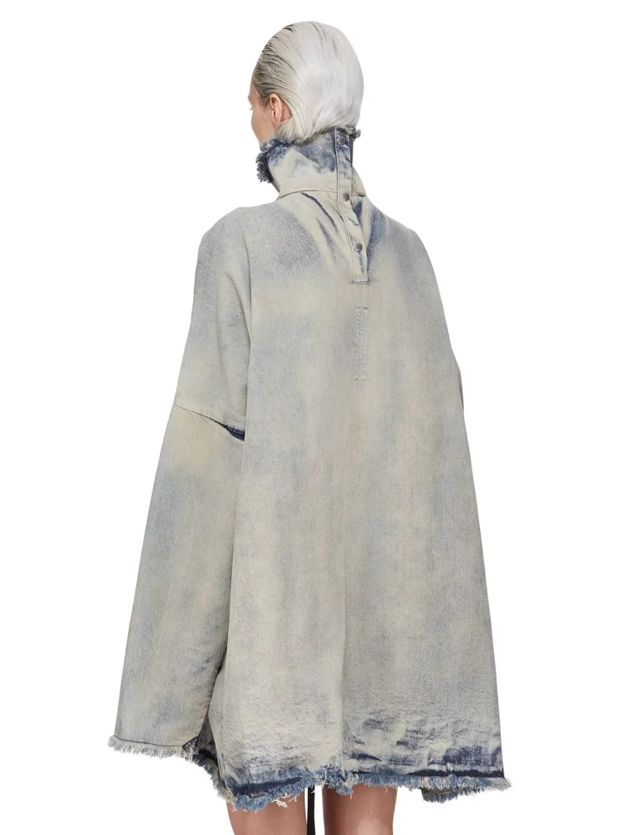 THIS JUMBO TABARD IS BELOW HIP LENGTH WITH A JUMBO BOXY FIT. IT HAS LONG SLEEVES, AND LOW SHOULDER SEAMS. IT FEATURES A HIGH COLLAR WITH A CENTRE BACK OPENING WITH SNAP CLOSURES AND A RAW CUT HEM, NECK AND SLEEVES.
