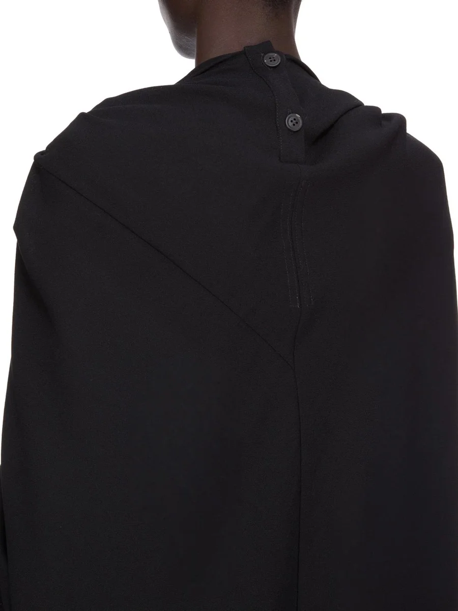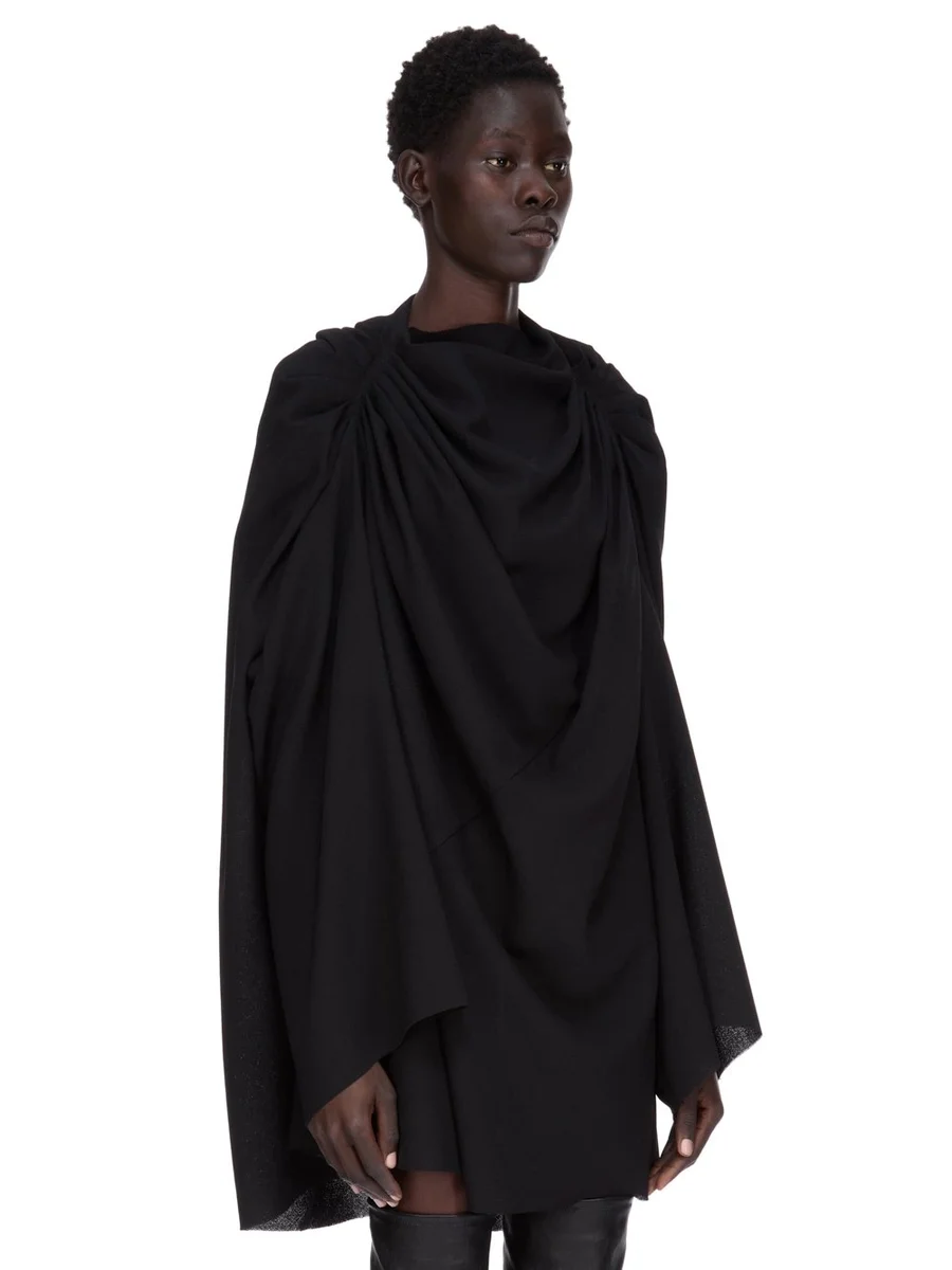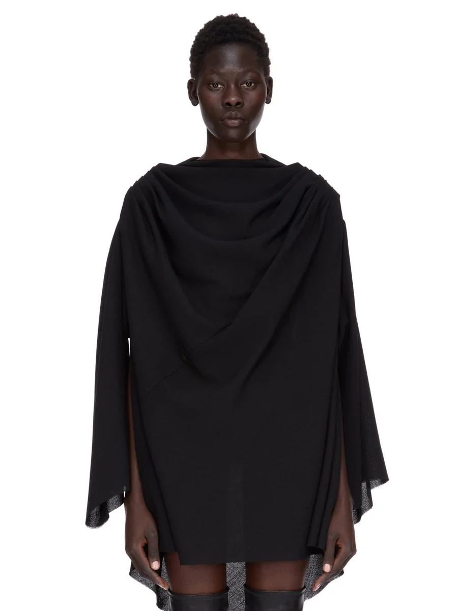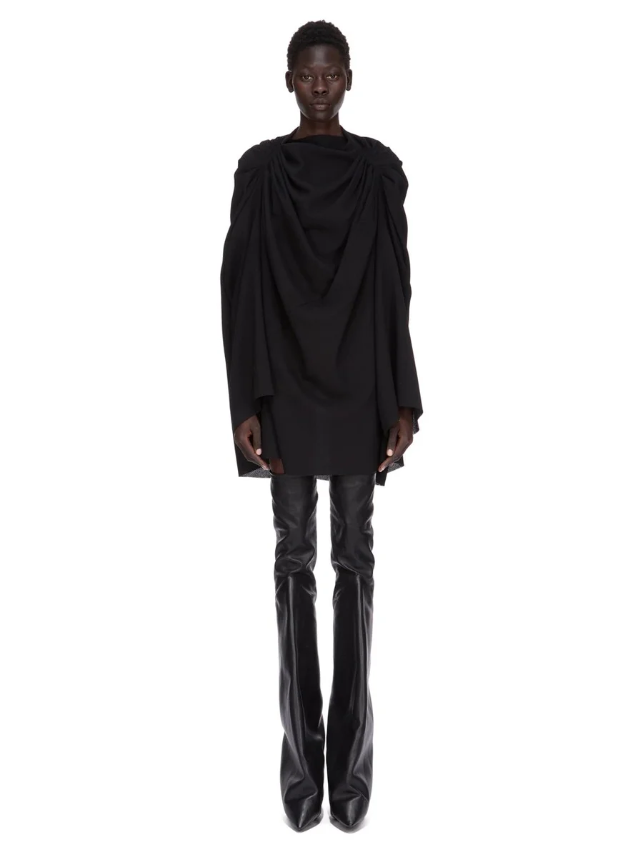 THIS CLAUDETTE MINI IS MID-THIGH LENGTH AT FRONT AND FALLS SLIGHTLY LONGER AT BACK. IT HAS LONG, WIDE SLEEVES AND SIDE OPENINGS SO THE ARM CAN BE WORN IN OR OUT. IT FEATURES A GATHERED, ROUNDED NECK, THAT CREATES MULTIPLE PLEATING AT THE SHOULDER, A BIAS CUT SEAM RUNNING ACROSS THE FRONT CHEST AND BACK, AND DRAPING AT FRONT AND BACK AND A ROUNDED AMPLE SHAPE AND A BUTTONED BACK NECK CLOSURE.