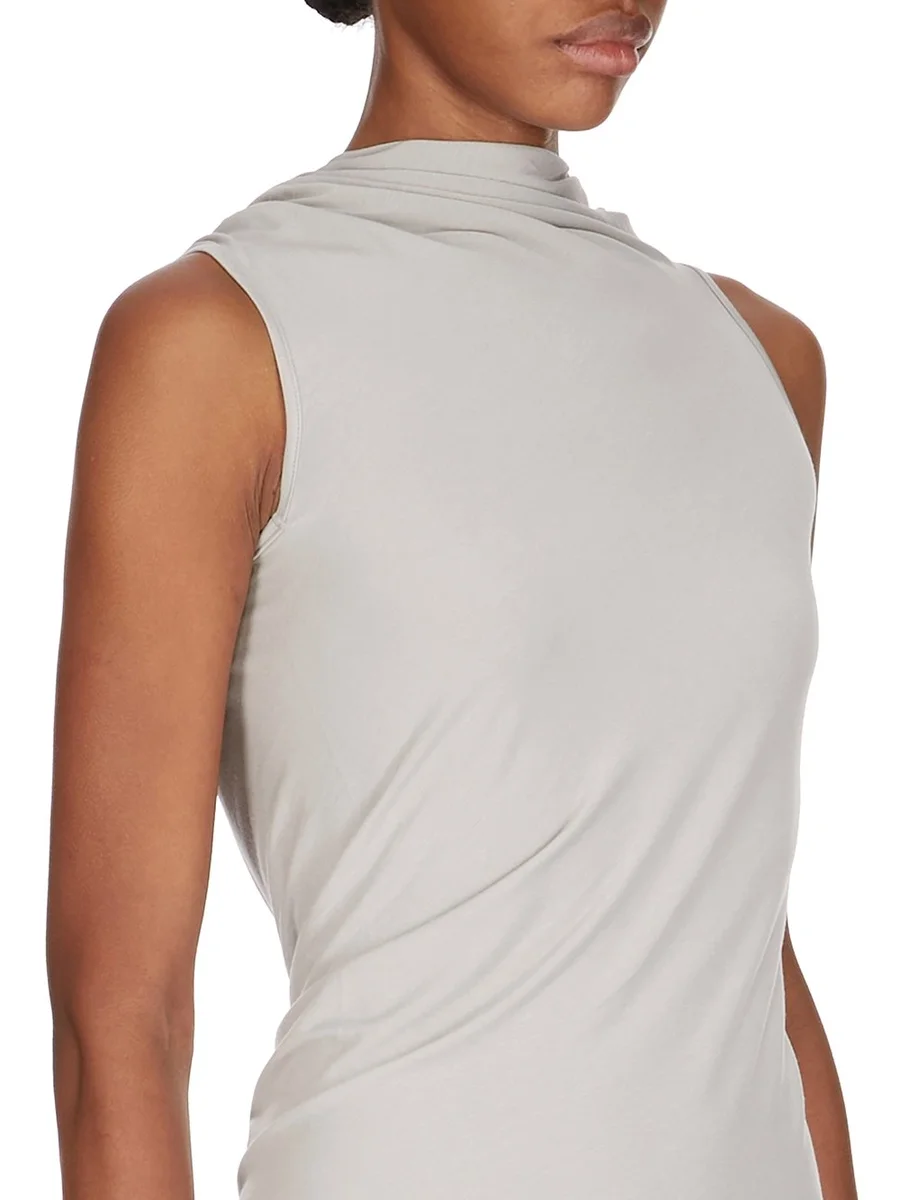 THIS EVA MINI IS MID-THIGH LENGTH AND SLEEVELESS. IT HAS A SLIGHTLY DRAPED BOAT NECK, WHICH FALLS INTO AN OPEN BACK, WITH A TWIST IN THE SMALL OF THE RIGHT HIP, AND A BODY SKIMMING FIT.